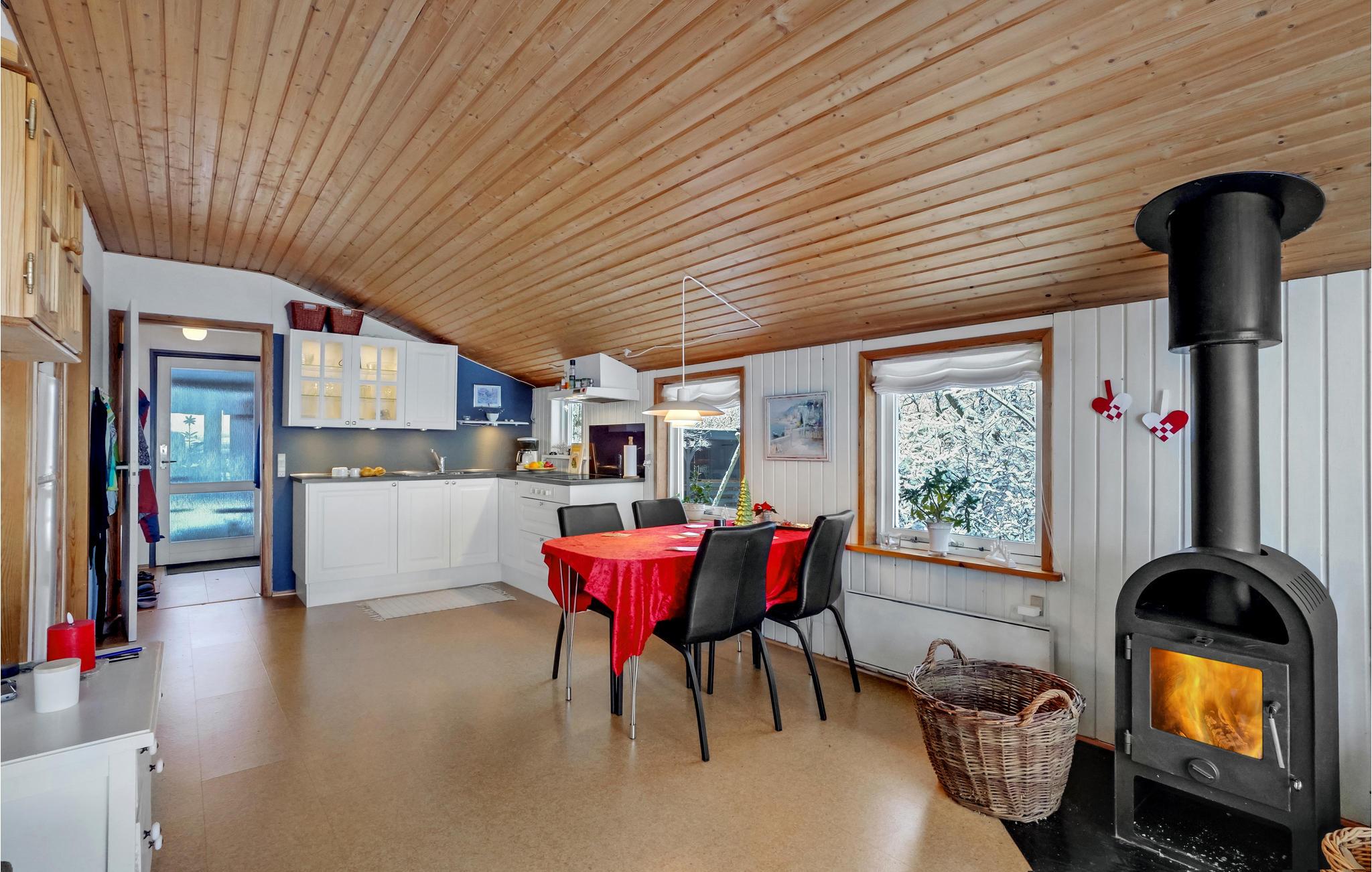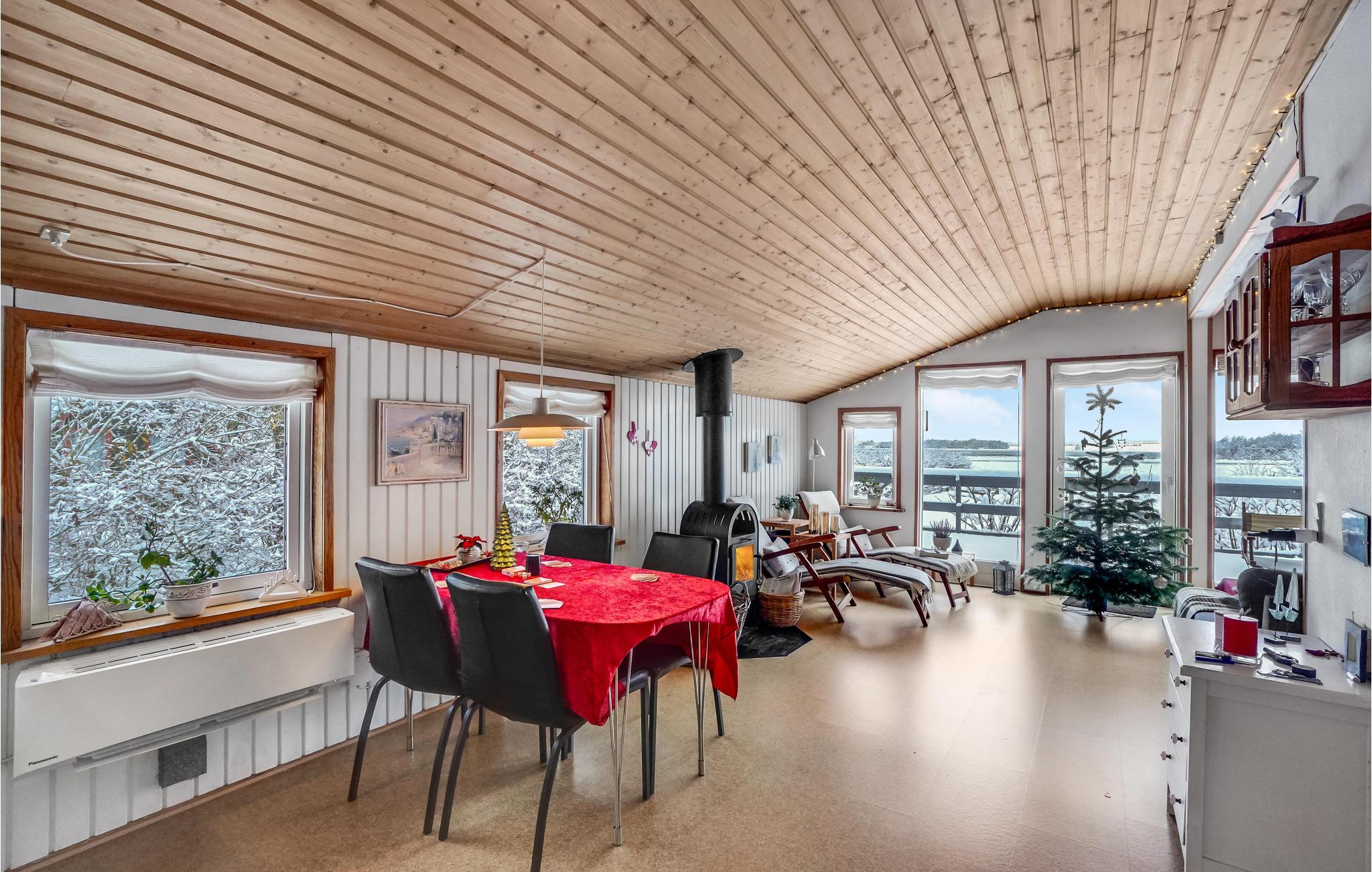 Føl jer hjemme i dette smukke og hyggelige sommerhus på alle tider af året. Sammen med jeres lille familie kan I trives her og slappe af. I køligere temperaturer kan I nyde en knitrende ild i brændeovnen eller spille brætspil ved spisebordet. I sommermånederne kan I fuldt ud nyde den store terrasse og beundre udsigten over fjorden, mens I spiser jeres yndlingsretter. Afrund milde sommeraftener med et glas vin og planlæg jeres aktiviteter for de kommende dage.