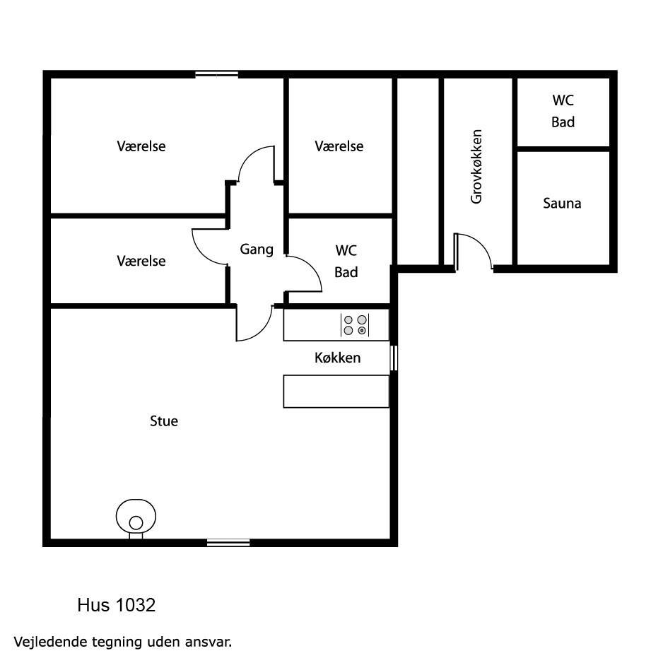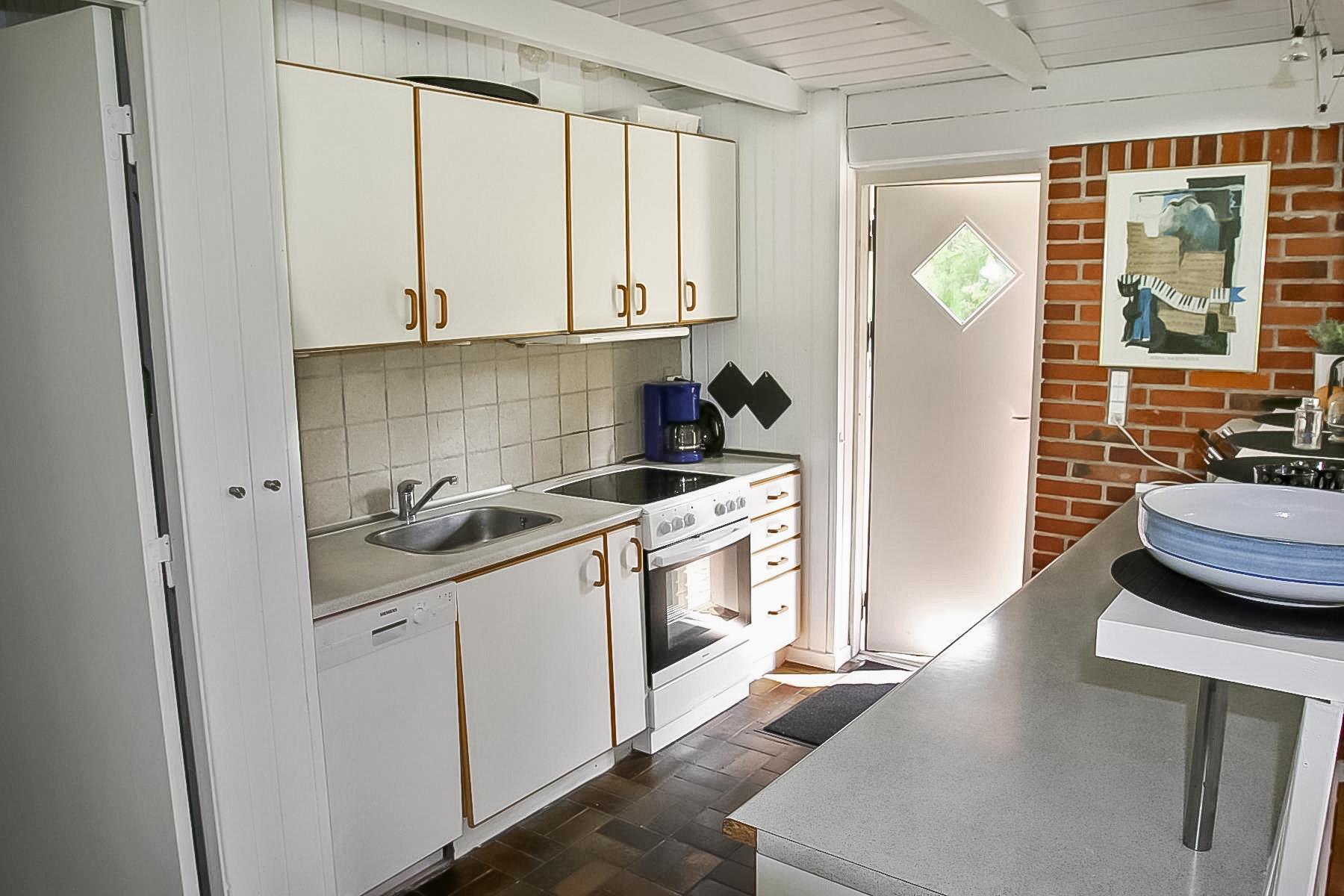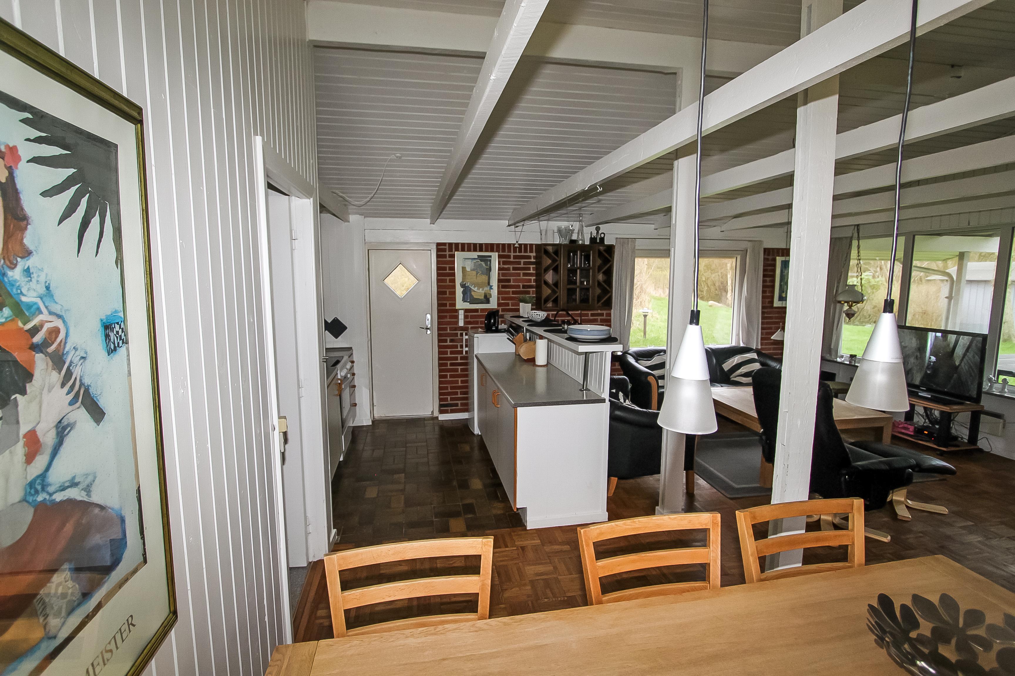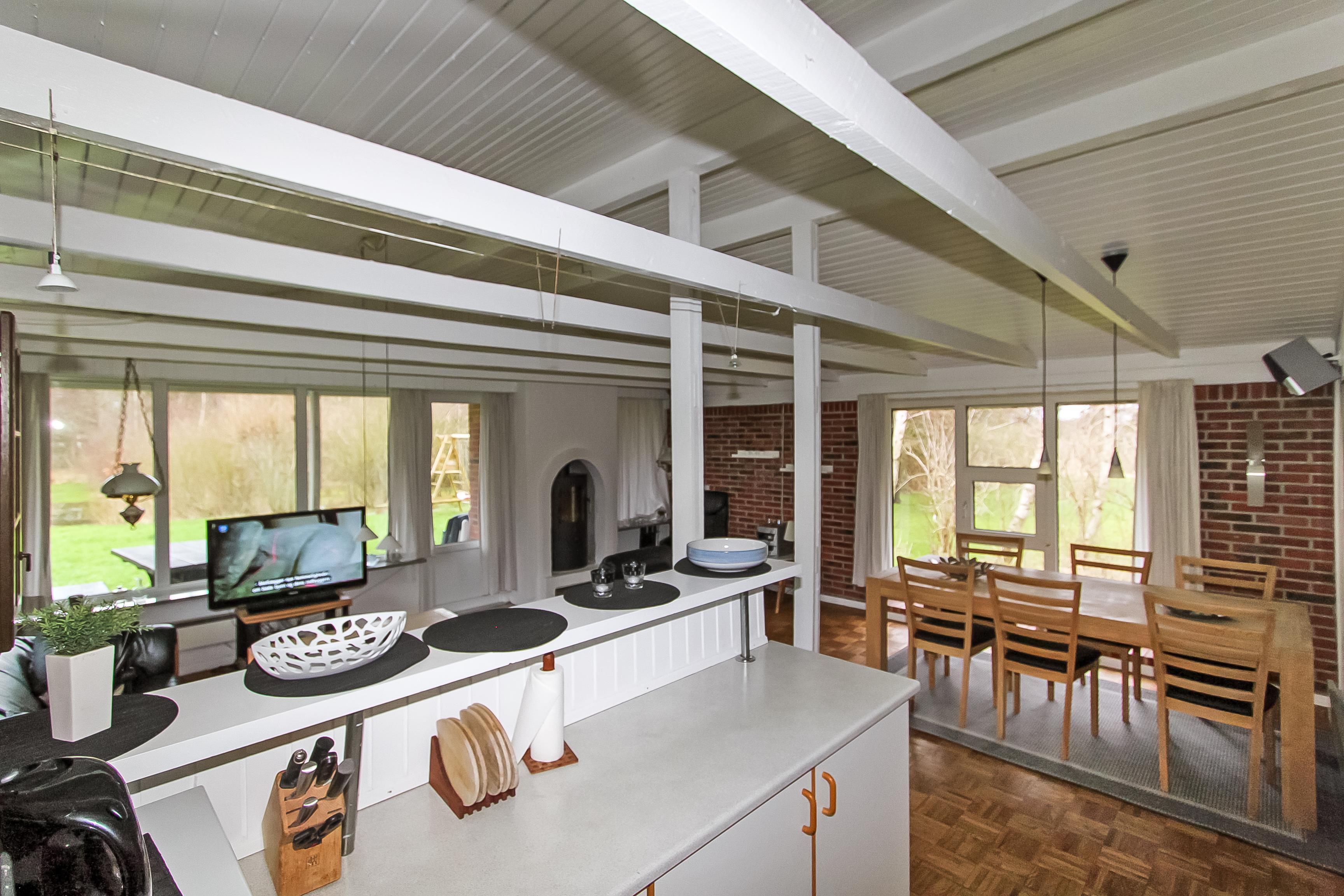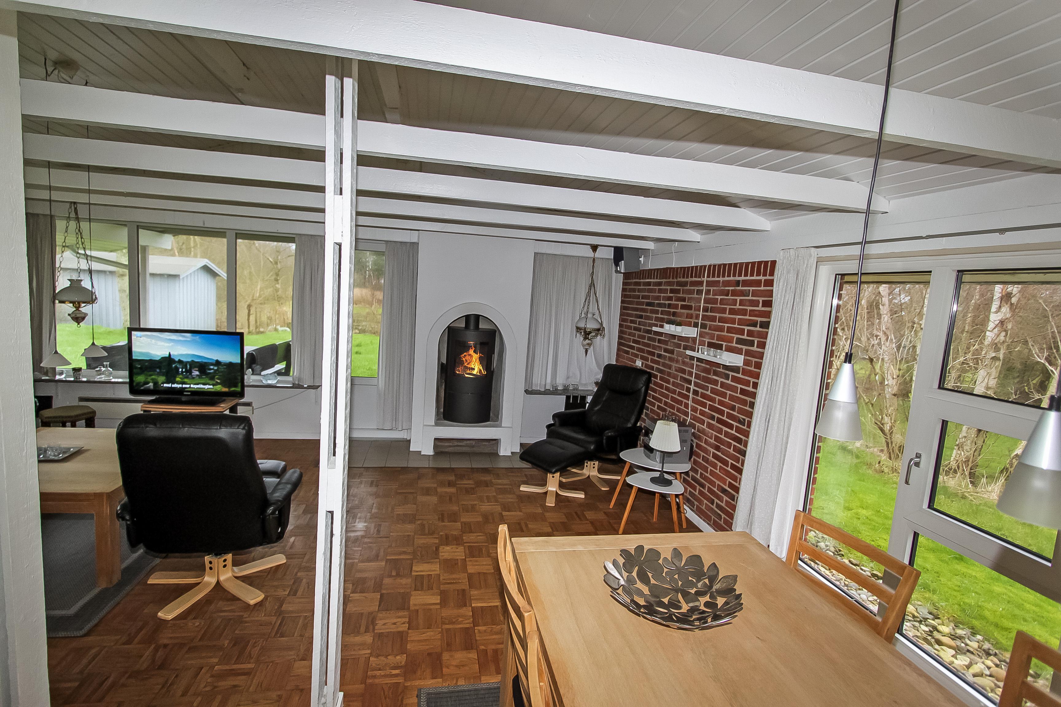 Sommerhuset er indrettet med kombineret stue og køkken. Køkkenet er veludstyret med keramiskkomfur, opvaskemaskine, emhætte, køleskab, separat fryser og mikrobølgeovn. Den store stue er lyst og pænt indrettet med komfortable lædermøbler. Der er TV med enkelte danske programmer og der parabol med mange tyske og nogle engelske kanaler. Der er gratis internetforbindelse samt stereoanlæg med cd-afspiller. Til en efterårsaften med regn og rusk eller en kølig sommeraften er der hyggelig brændeovn til at varme og sprede hygge. Huset er udstyret med ventilationsanlæg. Sommerhuse er indrettet til i alt 6 personer. Der er tre gode og lyse soveværelser. To er indrettet med dobbeltseng og et med to enkeltsenge. Badeværelset er lyst og pænt med toilet, håndvask, bruseniece og behagelig gulvvarme. Der er separat afdeling med husets sauna hvor i kan blive gennem varmet efter en lang travetur i områdets dejlige natur. I samme afdeling er der ekstra badeværelse med toilet, håndvask, bruseniece og gulvvarme. Der er desuden vaskemaskine til gæsternes rådighed. Til de yngste gæster er der barneseng og højstol. Det er næsten altid muligt at finde læ på en af de tre terrasser som hører til huset, hvortil der er såvel grill samt bålplads hvor i kan nyde de lune sommeraftner. Udenfor er der sandkasse, gynger, klatrestativ og naturlegeplads.