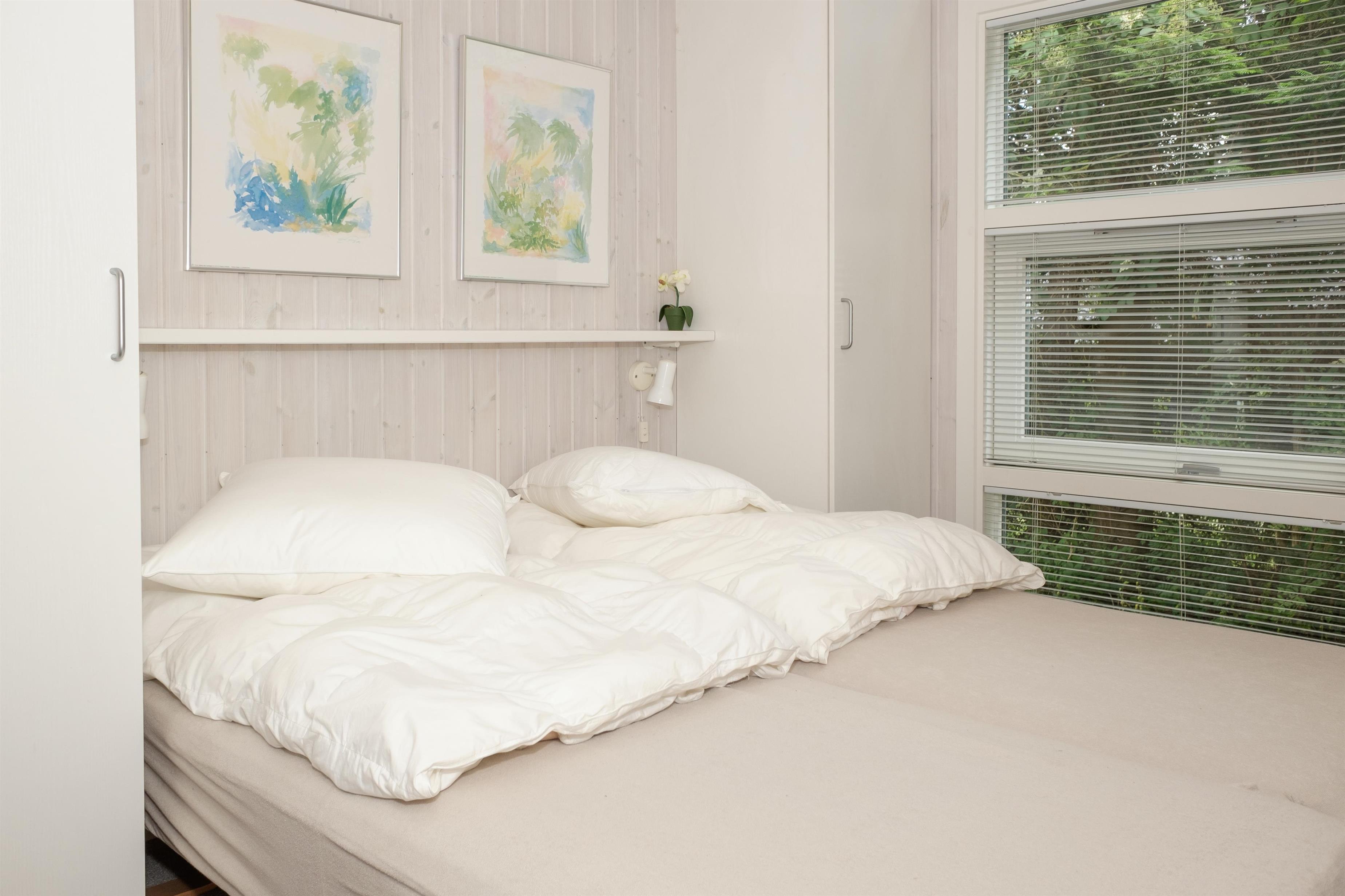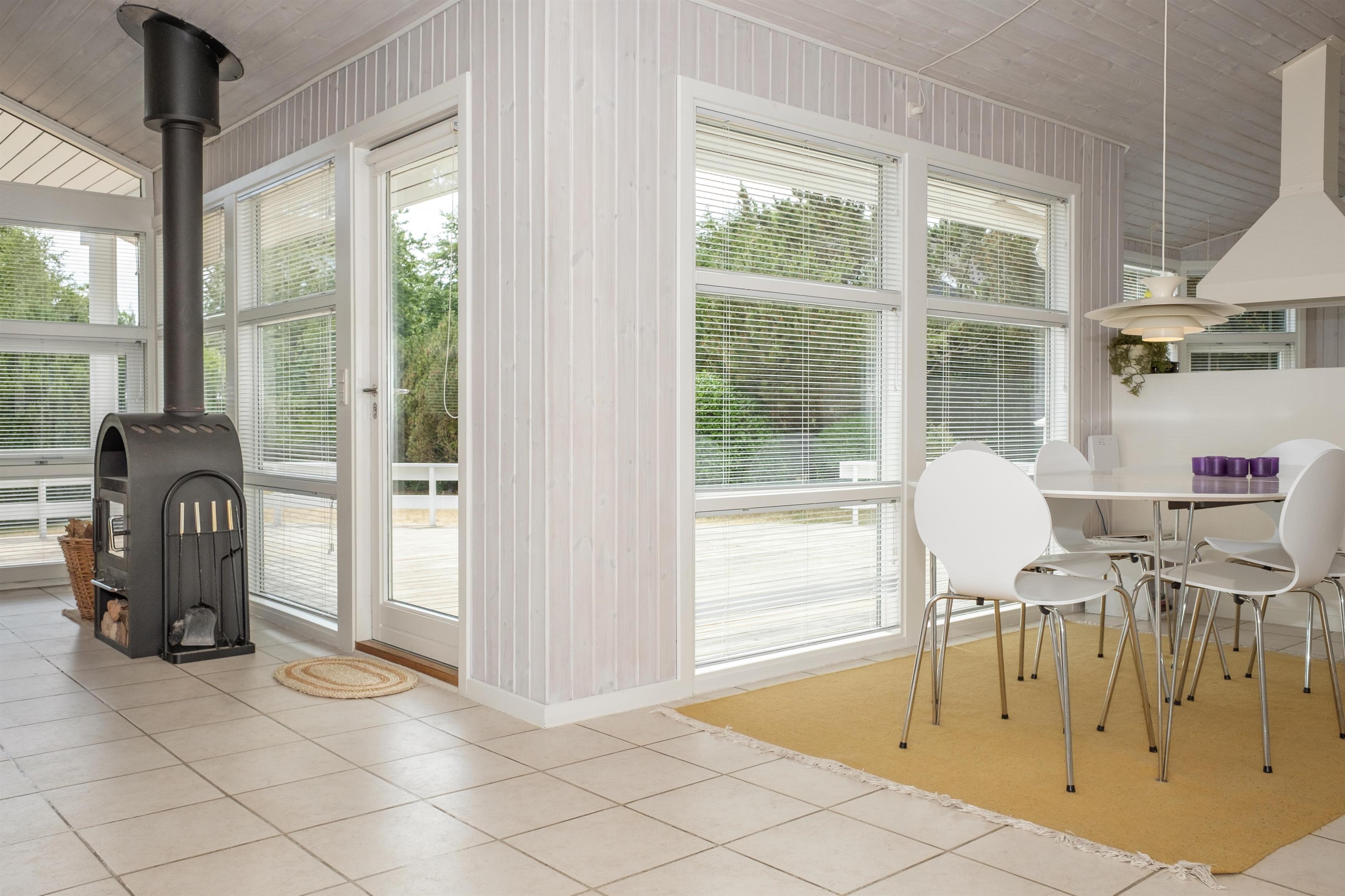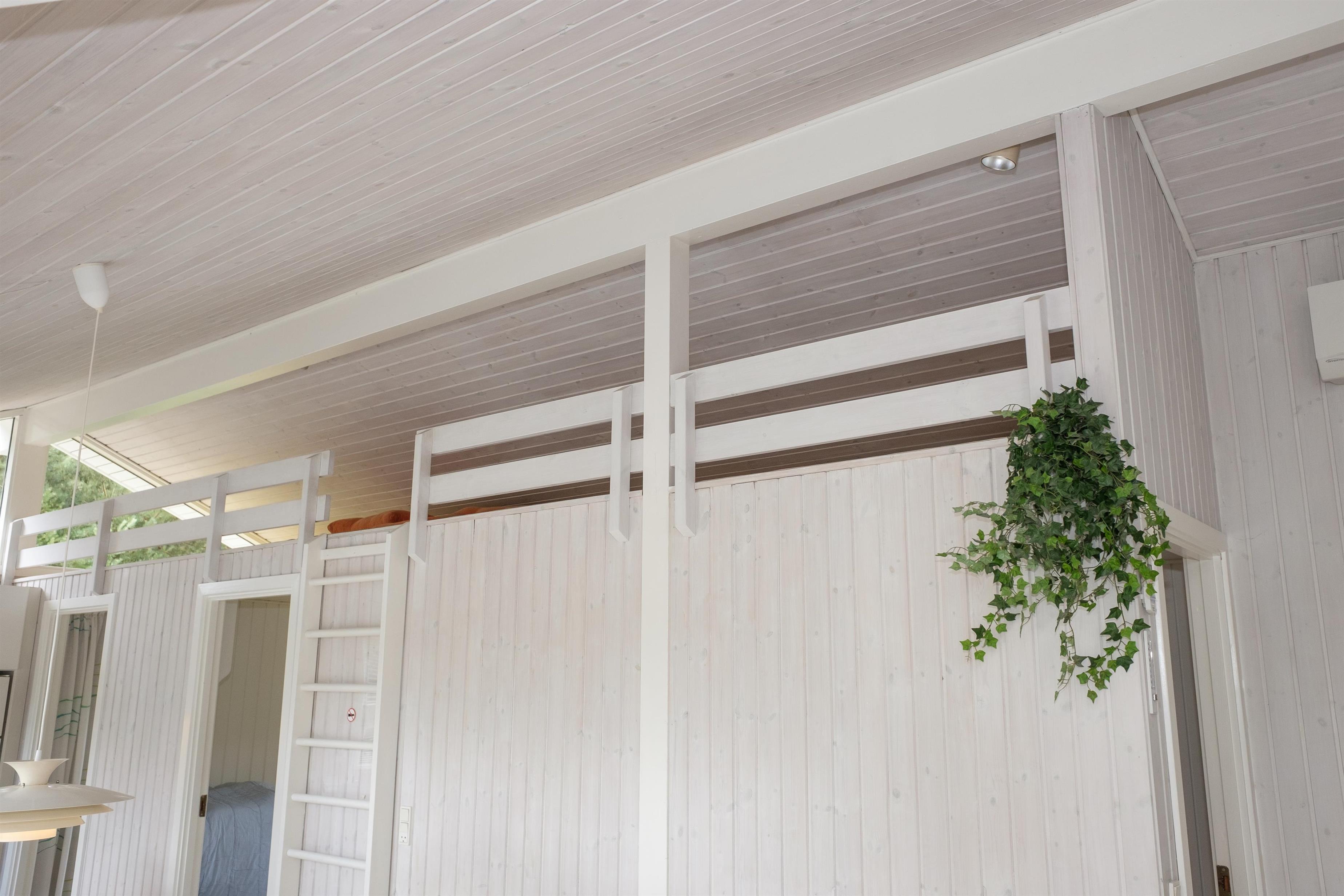Lys opholdsstue med åbning til kip, brændeovn, spiseafdeling til 6 og sofaarrangement med lænestol og TV. I åben forbindelse med stuen ligger det flotte køkken med hvidt inventar, komfur med keramiske kogeplader og ovn, køle-/fryseskab, opvaskemaskine og mikrobølgeovn.Der er 2 soveværelser med 2 enkeltsenge sat sammen, 1 soveværelse med 2 enkeltsenge samt hems, i alt 6 sovepladser. Dejligt badeværelse med gulvvarme, bruseniche, spabadekar og sauna. Bryggers med vaskemaskine og god opbevaringsplads. Huset har TV med danske (inkl. TV2) og tyske kanaler, DVD-afspiller, CD-afspiller og radio. Der er internetadgang.