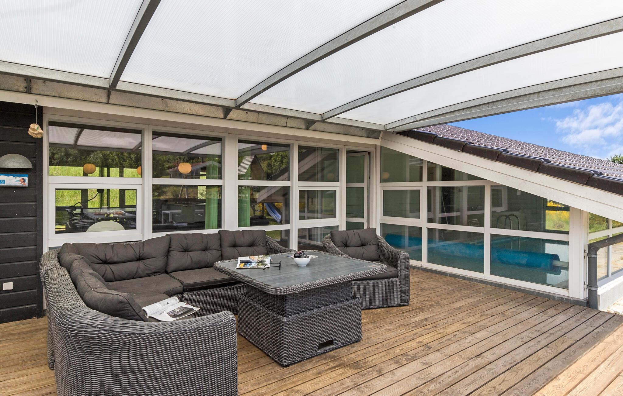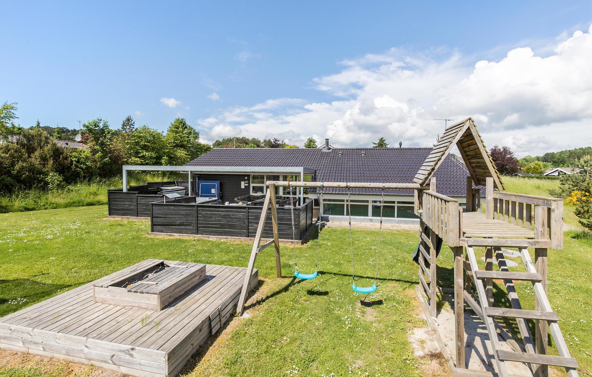Moderne sommerhus ved Lyngsbæk Strand med pool, sauna og børnevenlige faciliteter, perfekt til en afslappende ferie i naturskønne omgivelser.