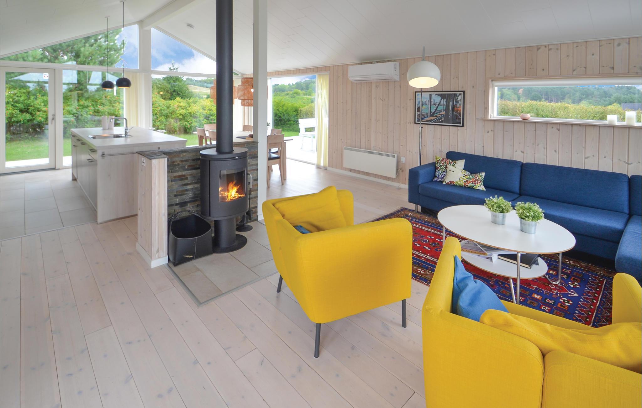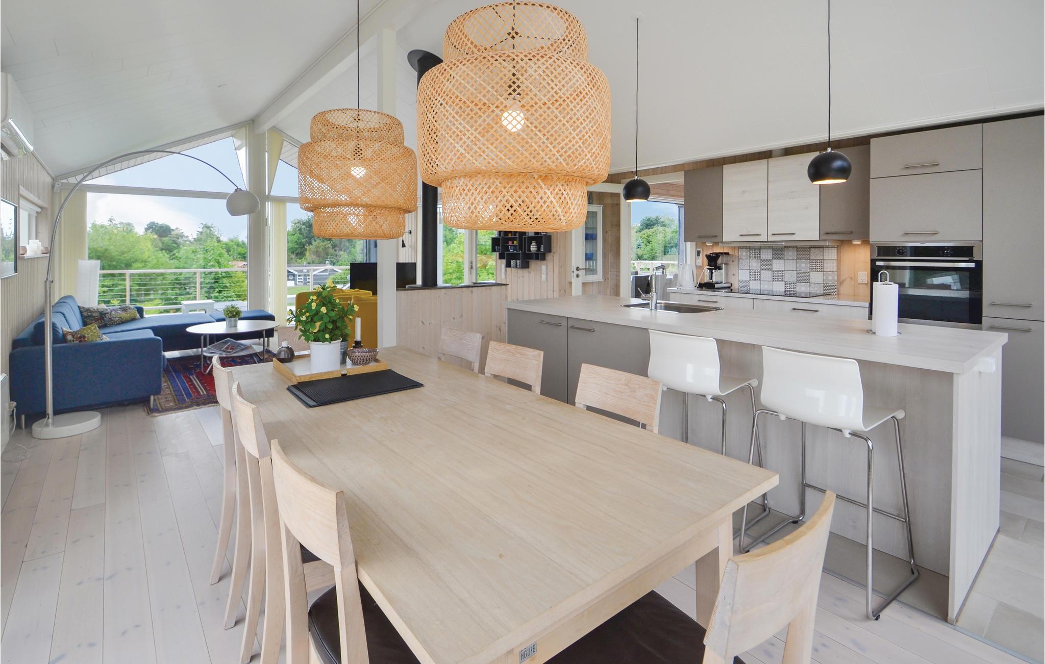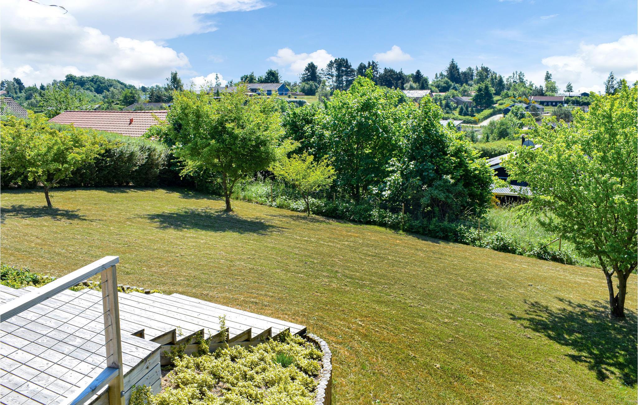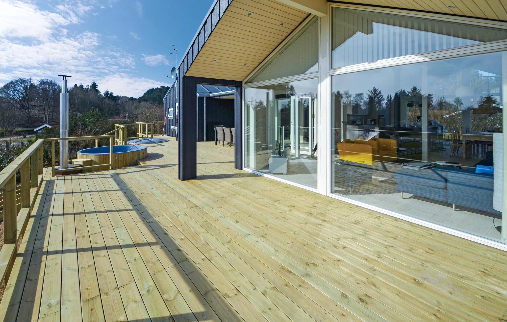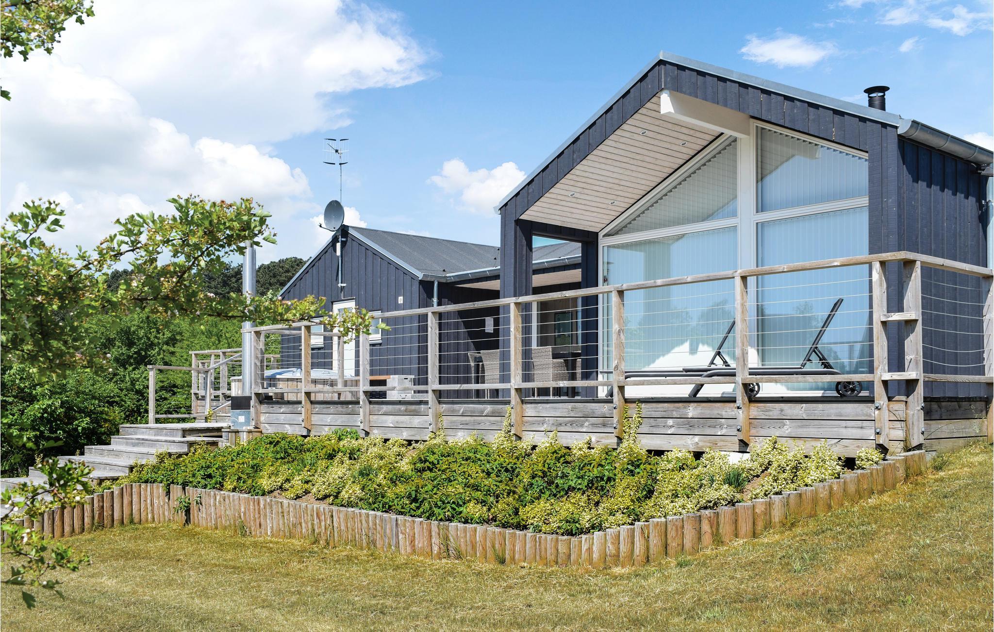 Nyt, moderne og super flot sommerhus med masse af kvalitet ogudstyr. Optimal indretning med bl.a. tre gode værelser, to luksus badeværelser, det ene med sauna. Huset har masse af plads, såvel ude som inde. Udendørs bydes på en kæmpestor træterrasse med integreret 6 - 8 pers. VILDMARKSBAD. En stor oplevelse at sidde ude i det varme vand og nyde udsigten. Huset er højt beliggende i området, med en god udsigt. Gå afstand til stranden, købmanden og flere spisesteder. Med huset som udgangspunkt er der mange udflugtsmuligheder bl.a. Mols Bjerge Nationalpark område, Ree Dyrepark.