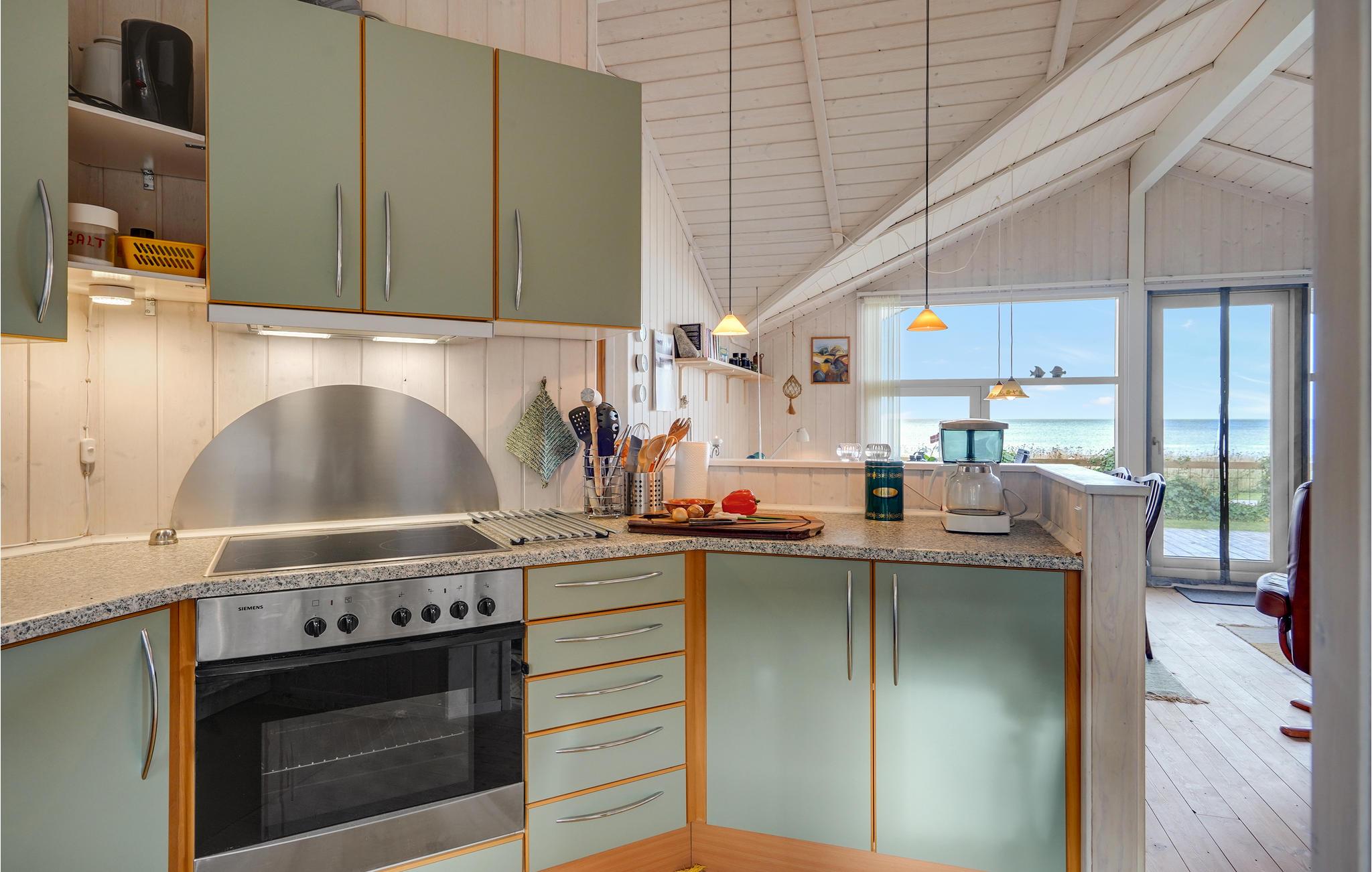 Lyst feriehus med brændeovn og panoramaudsigt, beliggende direkte ved stranden.