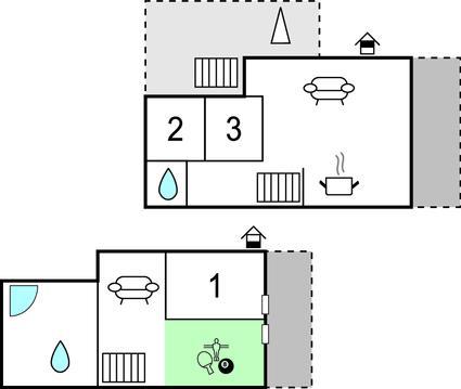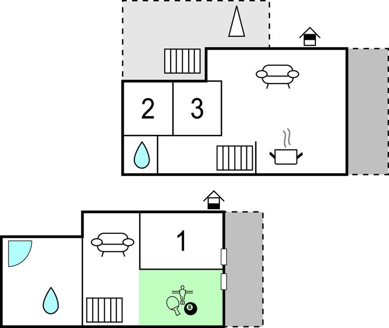 I parterre (adgang via en stejl trappe med gelænder) findes det tredje soveværelse med plads til en barneseng, et flot og stort badeværelse med dobbelt bruser, spabad og vaskemaskine. Der er ligeledes et opholdsrum med sækkestole til hyggelig tv-hygge med ynglingsserien samt et bordfodboldspil. Der er både svalegang/terrasse ved stuen, udgang til en stor vestvendt terrasse, hvor dejlige middage kan nydes samt en terrasse alene til vildmarksbadet.