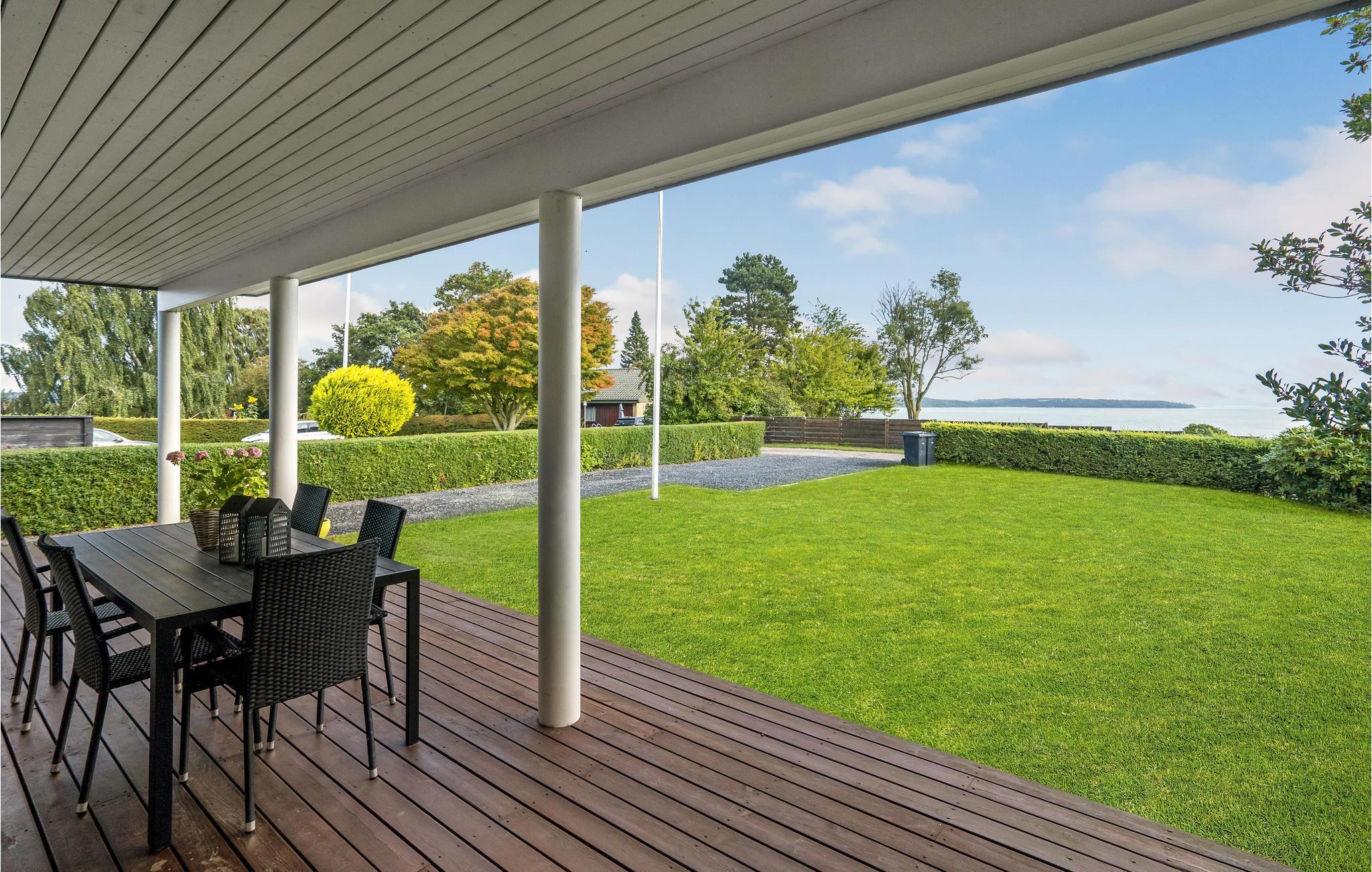 Feriehus med panoramaudsigt til Vejle Fjord, stor overdækket terrasse og adgang til badebro ved stranden.