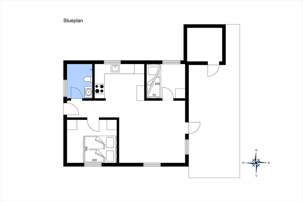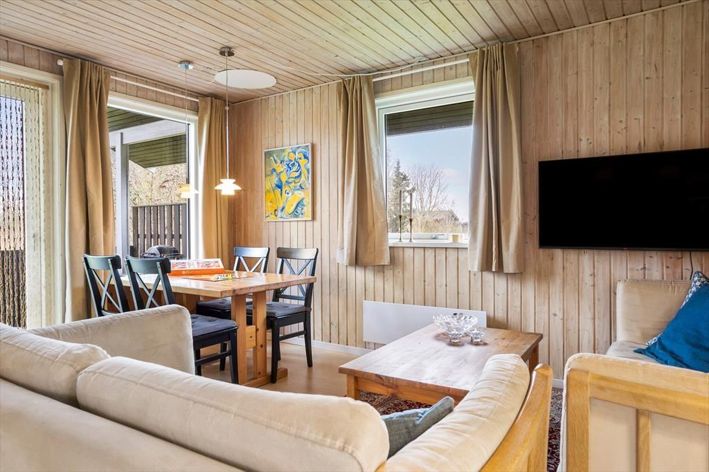 I sofahjørnet kan du slappe helt af med en bog, et spil, eller måske tænde for TV’et. Fra stuen kan I også nyde udsigten til det fredelige sommerhusområde og endda over markerne mod vest. Fra stuen kommer du let ud til den overdækkede terrasse via havedøren, så om sommeren kan terrassen fungere som et ekstra rum.