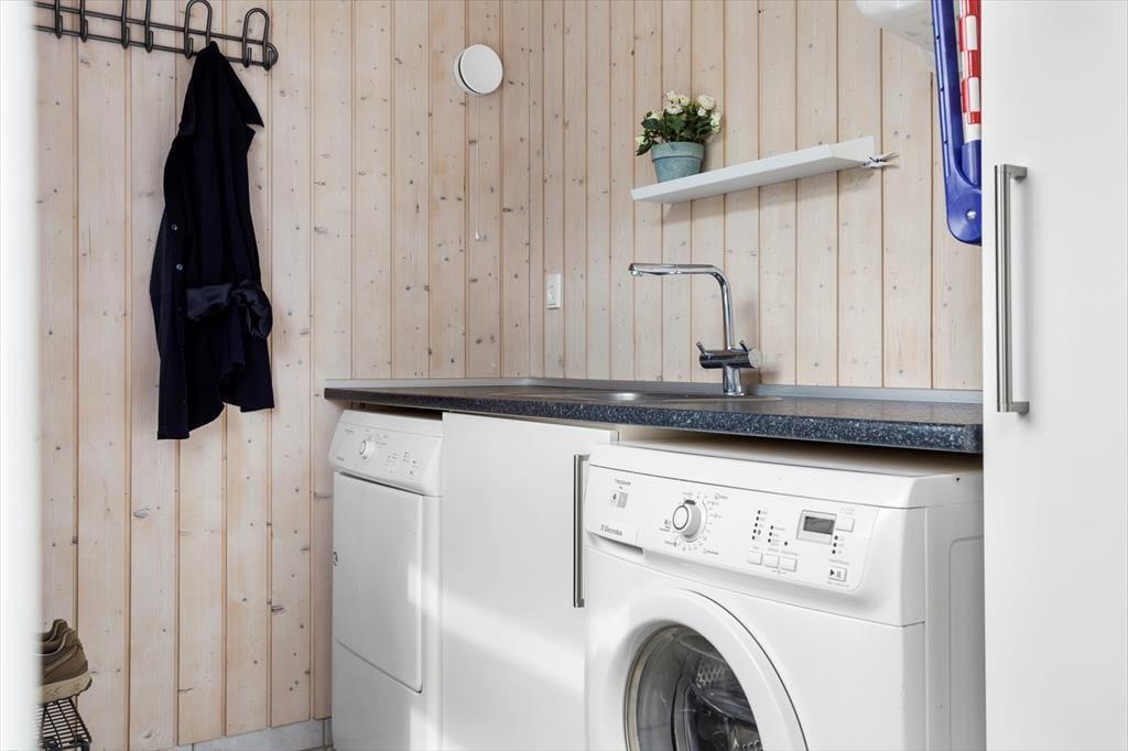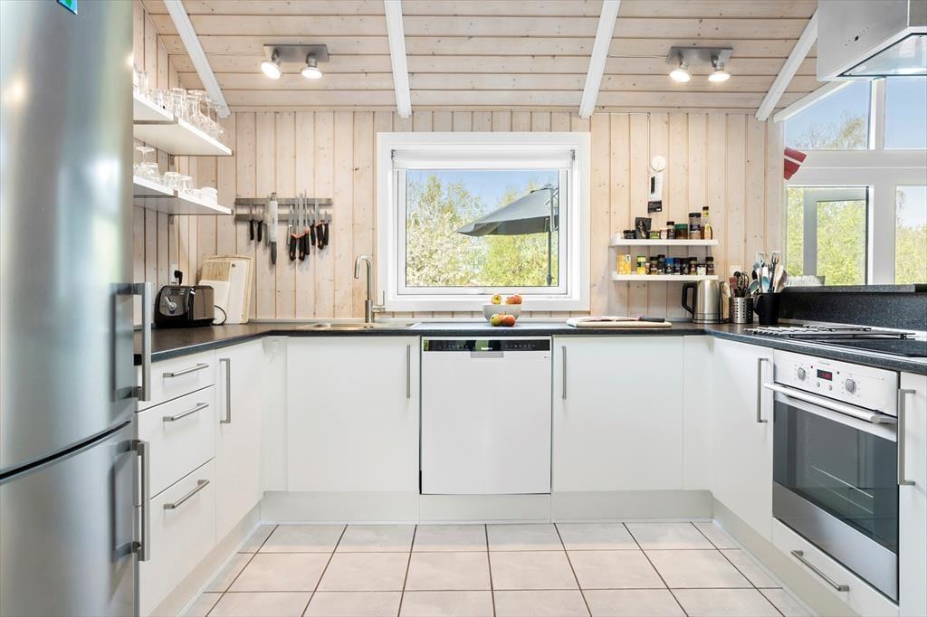 Køkkenet er et dejligt åbent køkken, hvor du kan stå over gryderne og samtidig tale med de andre ved spisebordet eller i stuen. I køkkenet er der god bordplads og alt hvad du skal bruge, når feriens måltider skal tilberedes.