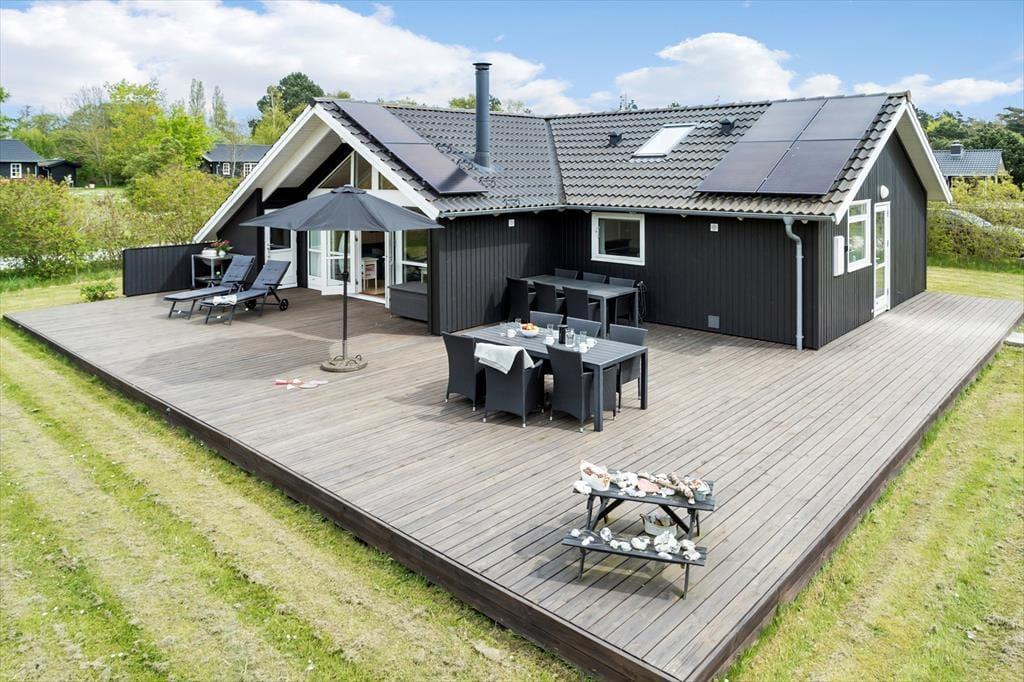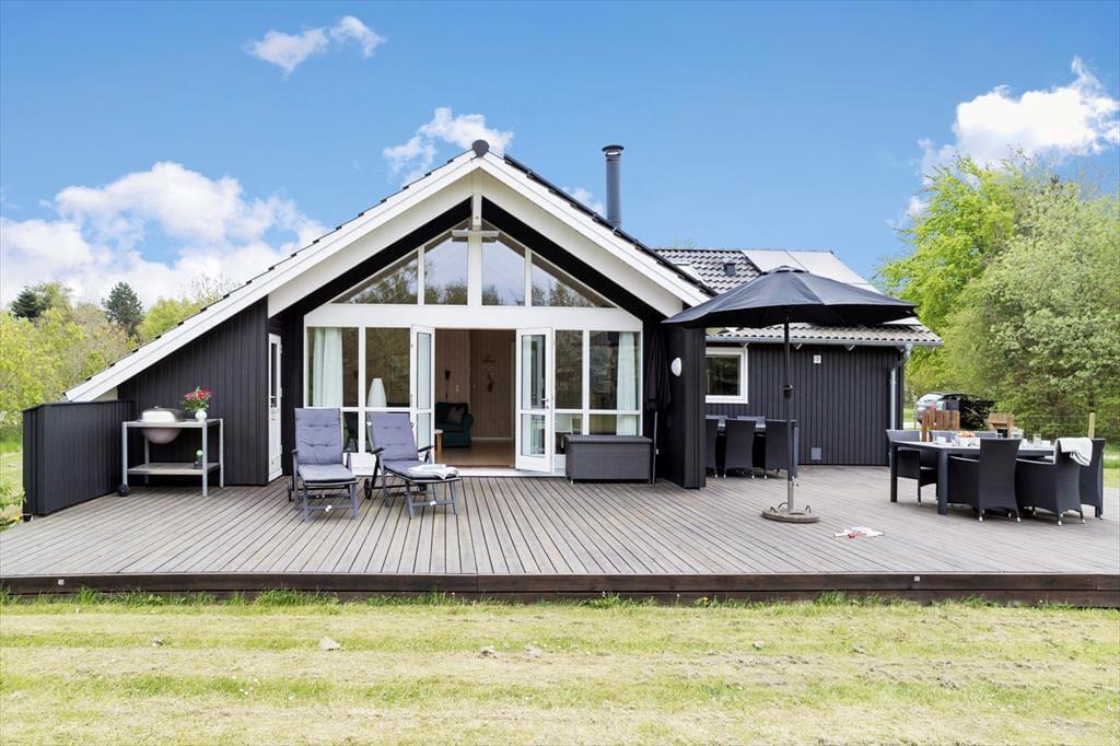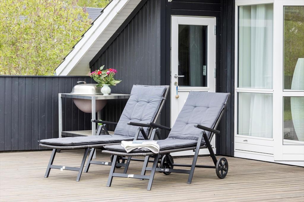 Fra entré og stue er der udgang til den syd-vest vendte terrasse, hvor der er god plads til havemøbler, så I kan nyde jeres måltider udenfor eller slappe af i solstolene. Husets hjørner gør, at I let kan finde et sted udenfor med læ og måske endda sol. Den store terrasse og åbne have gør det i den grad muligt at nyde roen og ferien i sommerhuset til fulde.