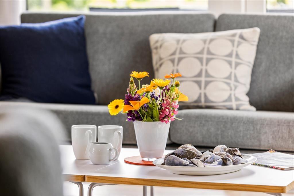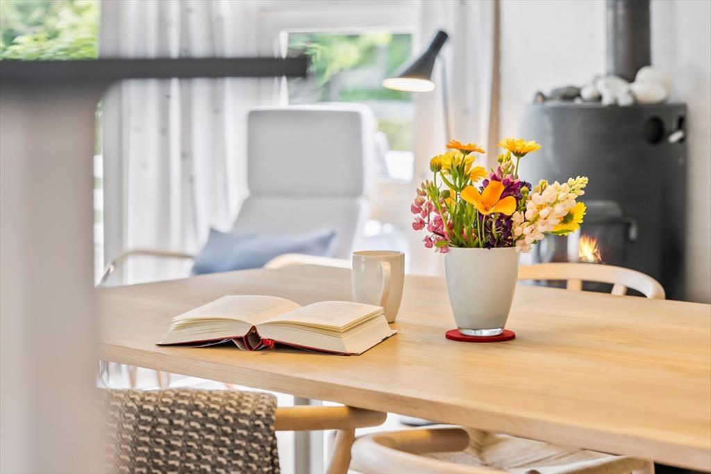 Spisebordet er centralt placeret i rummet, og her kan I samles om måltiderne eller planlægge dagens oplevelser. Huset har et åbent og fuldt udstyret køkken, så I kan let tilberede feriens måltider her. Samtidig kan du stadig være med i samtalerne om spisebordet, hvis du står over gryderne.