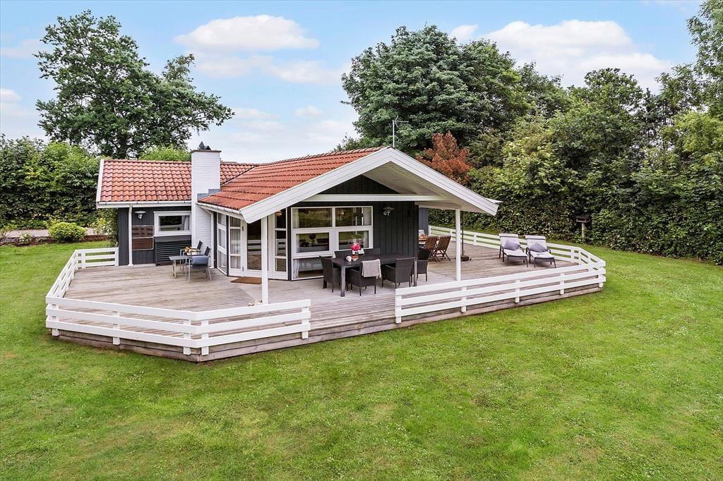 Rundt om huset er en træterrasse, der gør det muligt både at finde læ og sol. På den syd-øst vendte adresse er det helt perfekt at nyde sin morgenkaffe. Den dejlige overdækkede terrasse, har udgang fra stuen, og det bliver som et ekstra opholdsrum, når vejret tillader det. Her kan du nyde måltiderne til langt ud på aftenen. Huset ligger for enden af en rolig grusvej, så her kan I glæde jer til en afslappet ferie helt tæt på naturen.