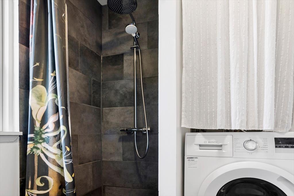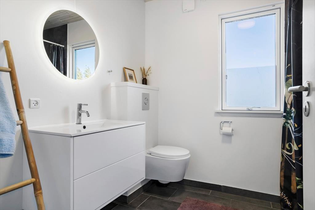Husets hjerte er det åbne køkken-alrum, der forbinder køkkenet med spiseområdet og stuen. Her kan I tilberede lækre måltider, mens I stadig kan nyde udsigten til både stuen og terrassen. De store vinduer lader dagslyset strømme ind og giver jer en skøn udsigt til den rummelige, grønne have. Fra stuen er der direkte adgang til terrassen, der på solrige dage fungerer som en naturlig forlængelse af opholdsområdet.