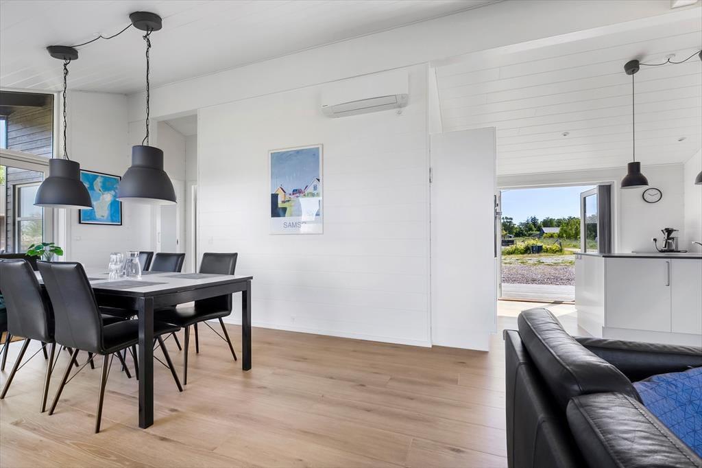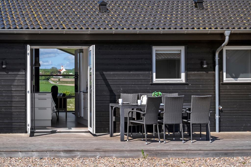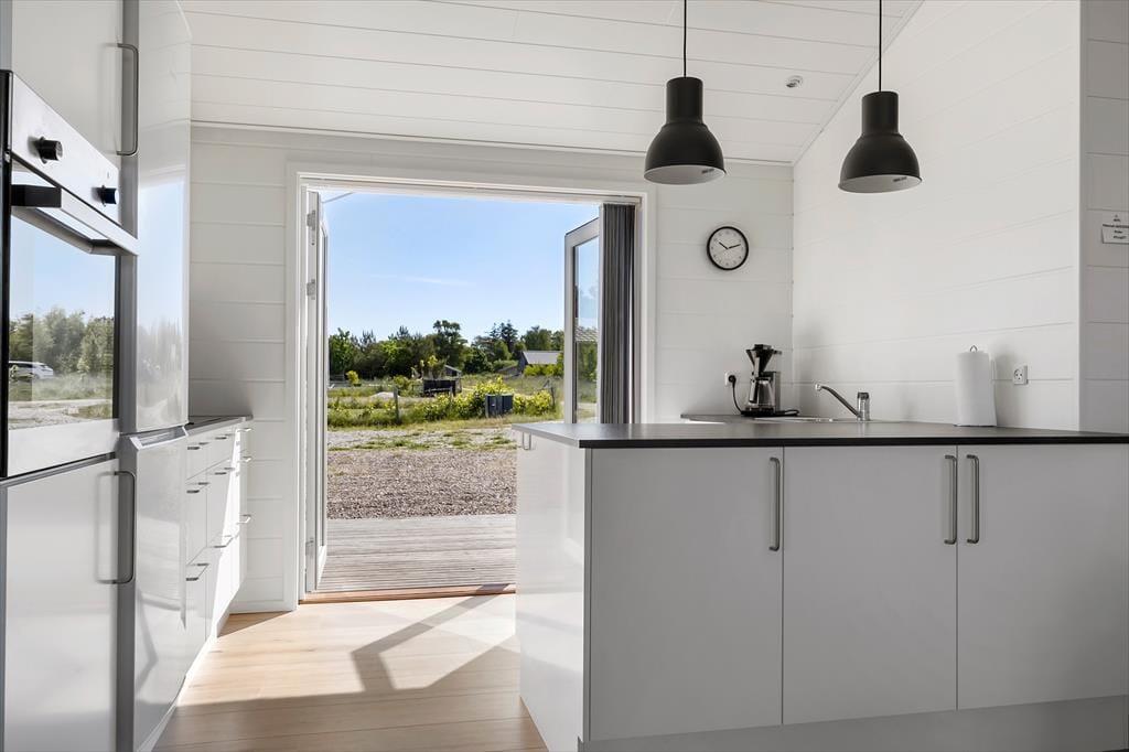 Køkkenet er åbent og har vinduer med udsigt til haven og den østvendte terrasse, hvilket giver et dejligt lysindfald og udsigt over det åbne landskab. Rundt om spisebordet er der god plads til, at I alle kan nyde måltiderne sammen. Når vejret tillader det, kan I via havedøren gå direkte ud på terrassen og spise under åben himmel.