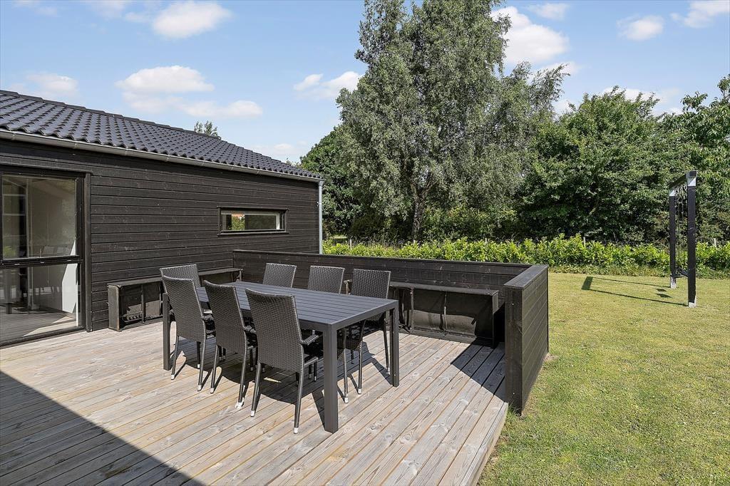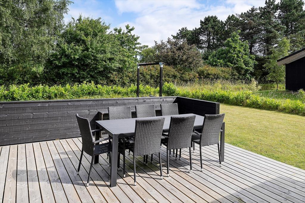 De store træterrasser ved huset giver jer mulighed for at følge solen fra morgen til aften. Her kan I spise udendørs, læne jer tilbage i liggestole eller bare nyde naturen. Terrassen mod øst er ideel til morgenkaffen og stille morgener.