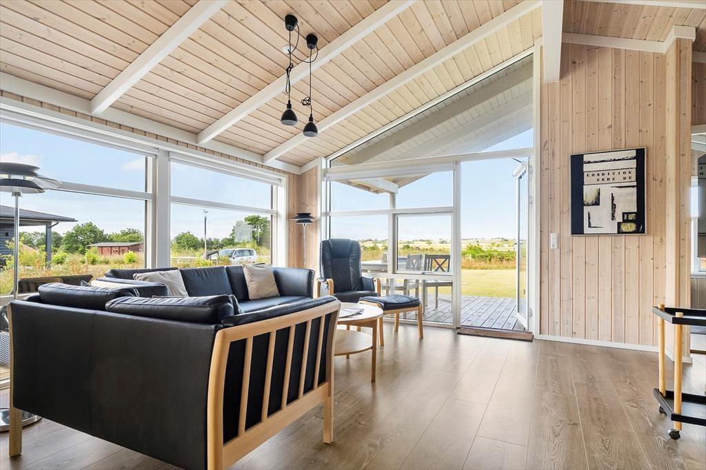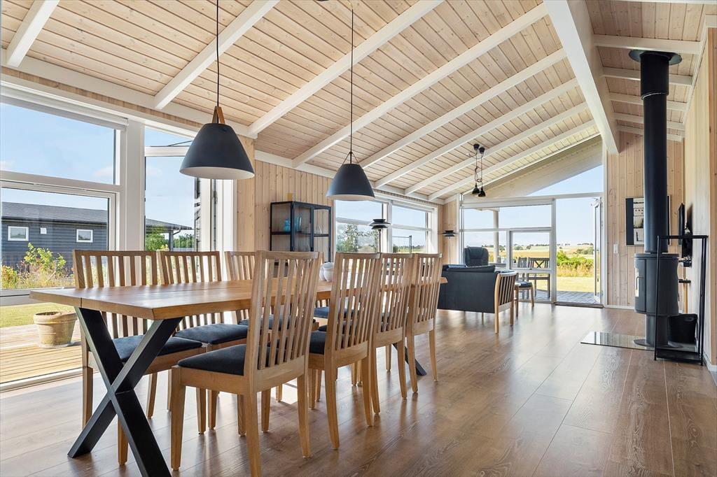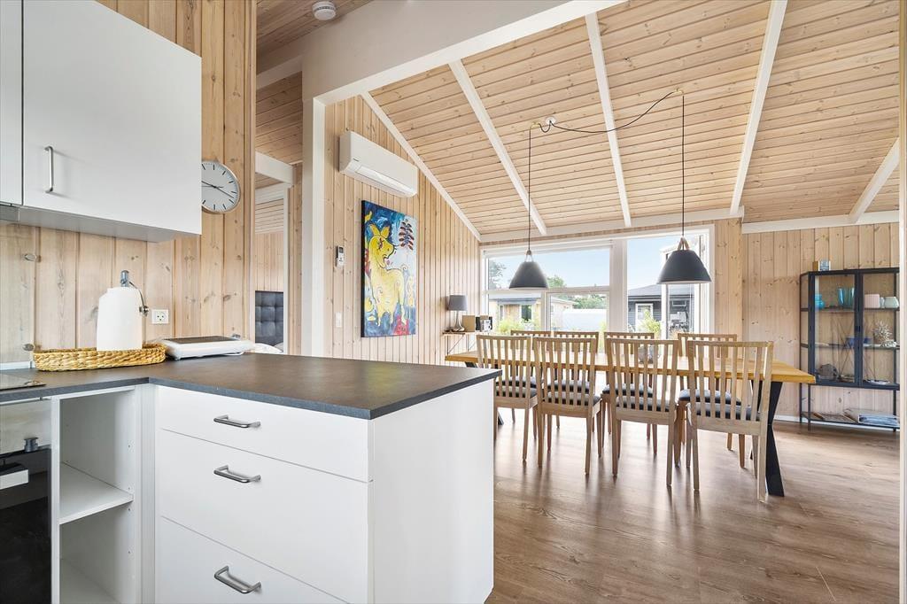 Køkkenet er åbent og har vinduer med udsigt til haven og den sydøstvendte terrasse, hvilket giver et dejligt lysindfald og udsigt over det åbne landskab. Rundt om spisebordet er der god plads til, at I alle kan nyde måltiderne sammen.