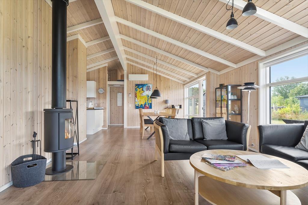 Huset er indrettet i en gennemført hyggelig stil med lyse trævægge og -lofter og en stemning, der emmer af strand og natur. Her er sørget for både nødvendige og ekstra komfortable faciliteter – I skal blot glæde jer til en dejlig ferie i Mårup på Samsø.