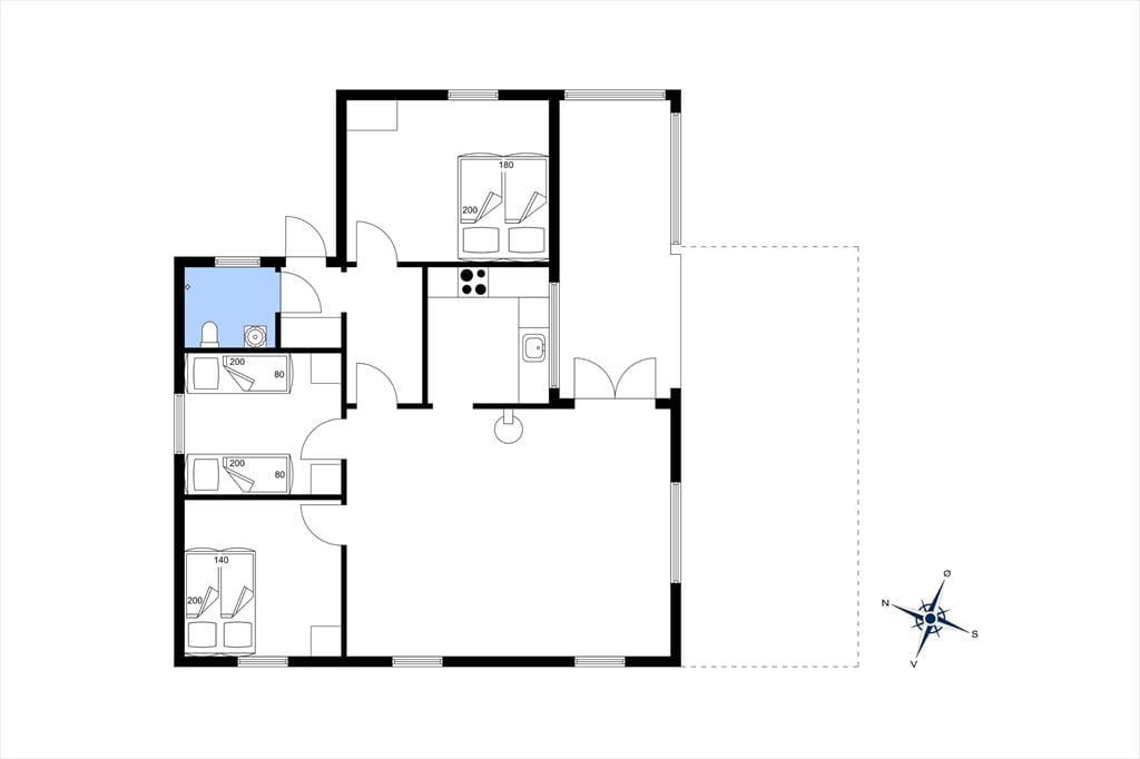 Sommerhuset rummer tre soveværelser: to med dobbeltseng og ét med to enkeltsenge. Derudover er der badeværelse, stue og køkken i huset.