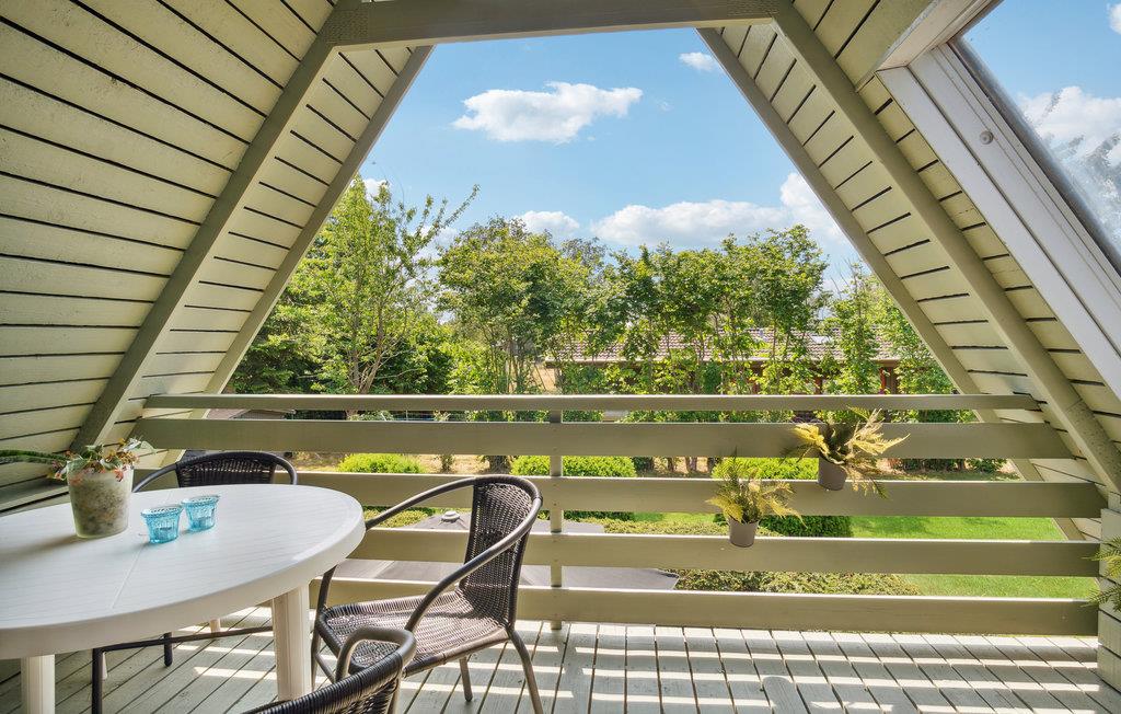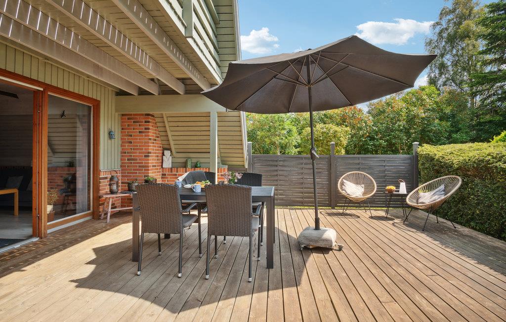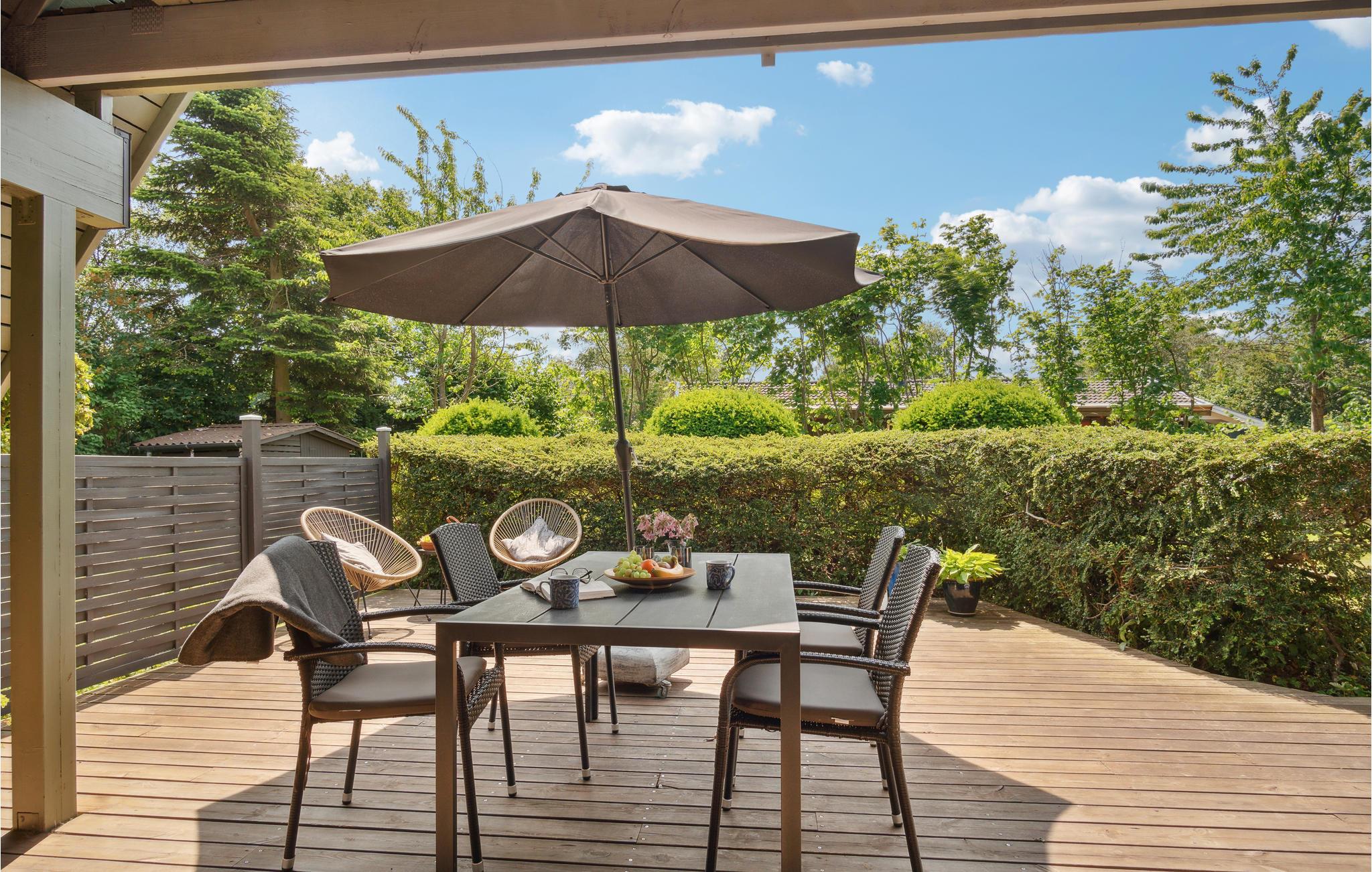 Terrassen byder på beskyttede siddepladser, hvilket gør den til et godt sted til både udendørs spisning og uforstyrret solbadning.