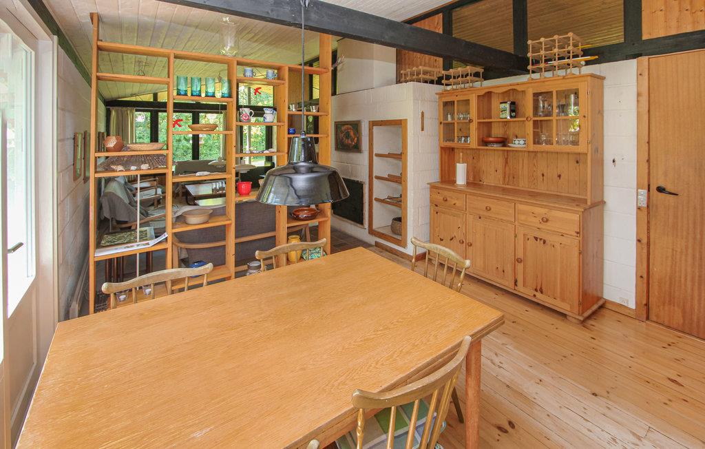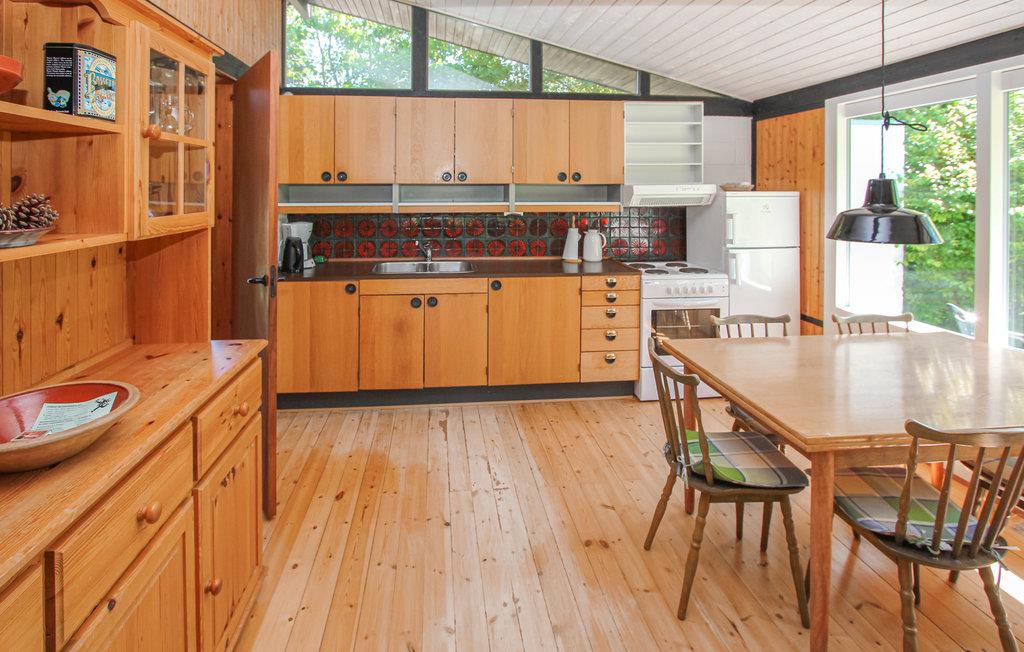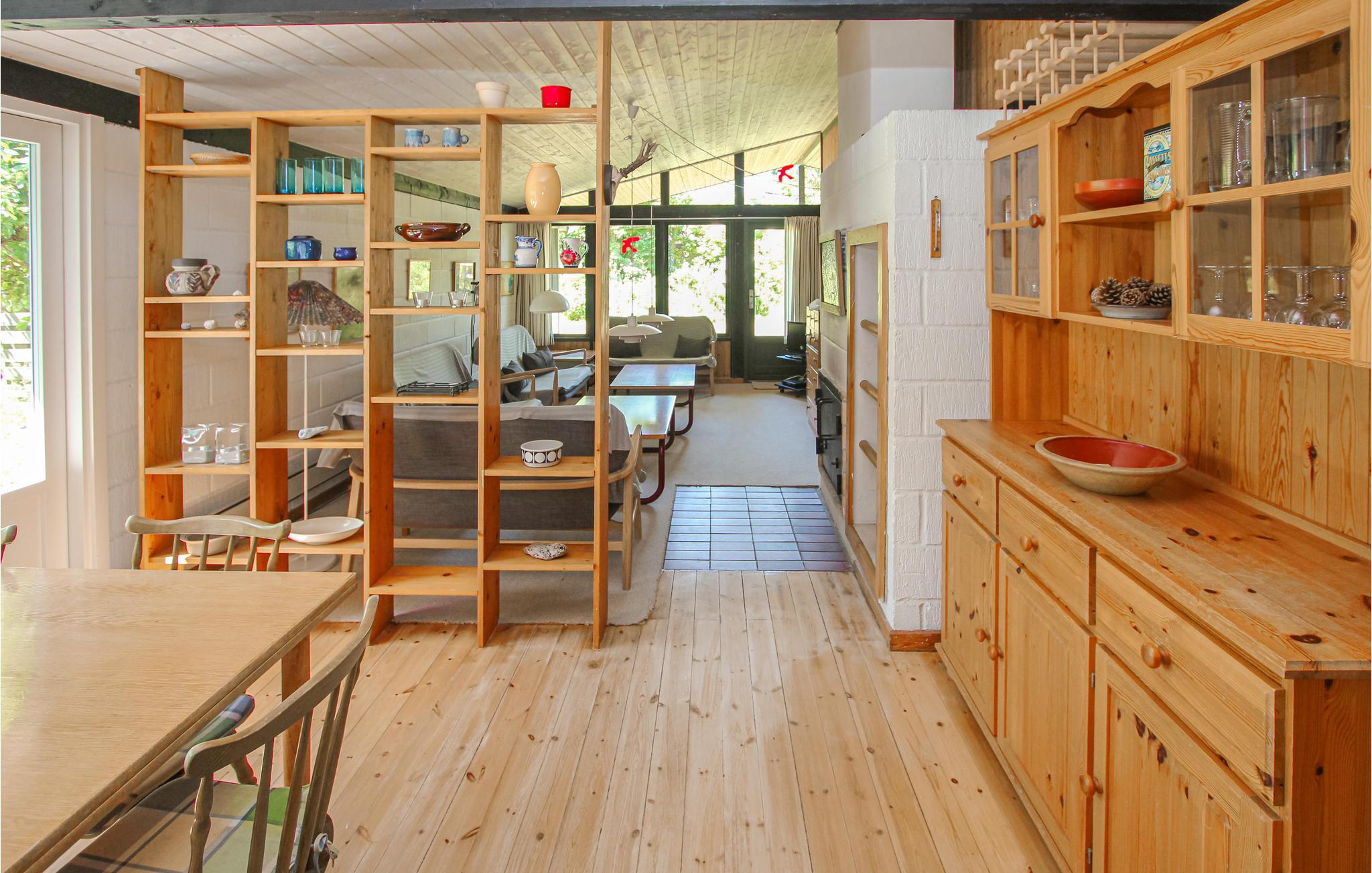 Huset fortryller med hyggelige værelser, der er omhyggeligt indrettet i retrostil. De mange træelementer bidrager til den gode stemning i feriehuset. Glæd jer til at lave mad sammen i det åbne køkken og til hyggelige aftener ved den knitrende ild i brændeovnen.
