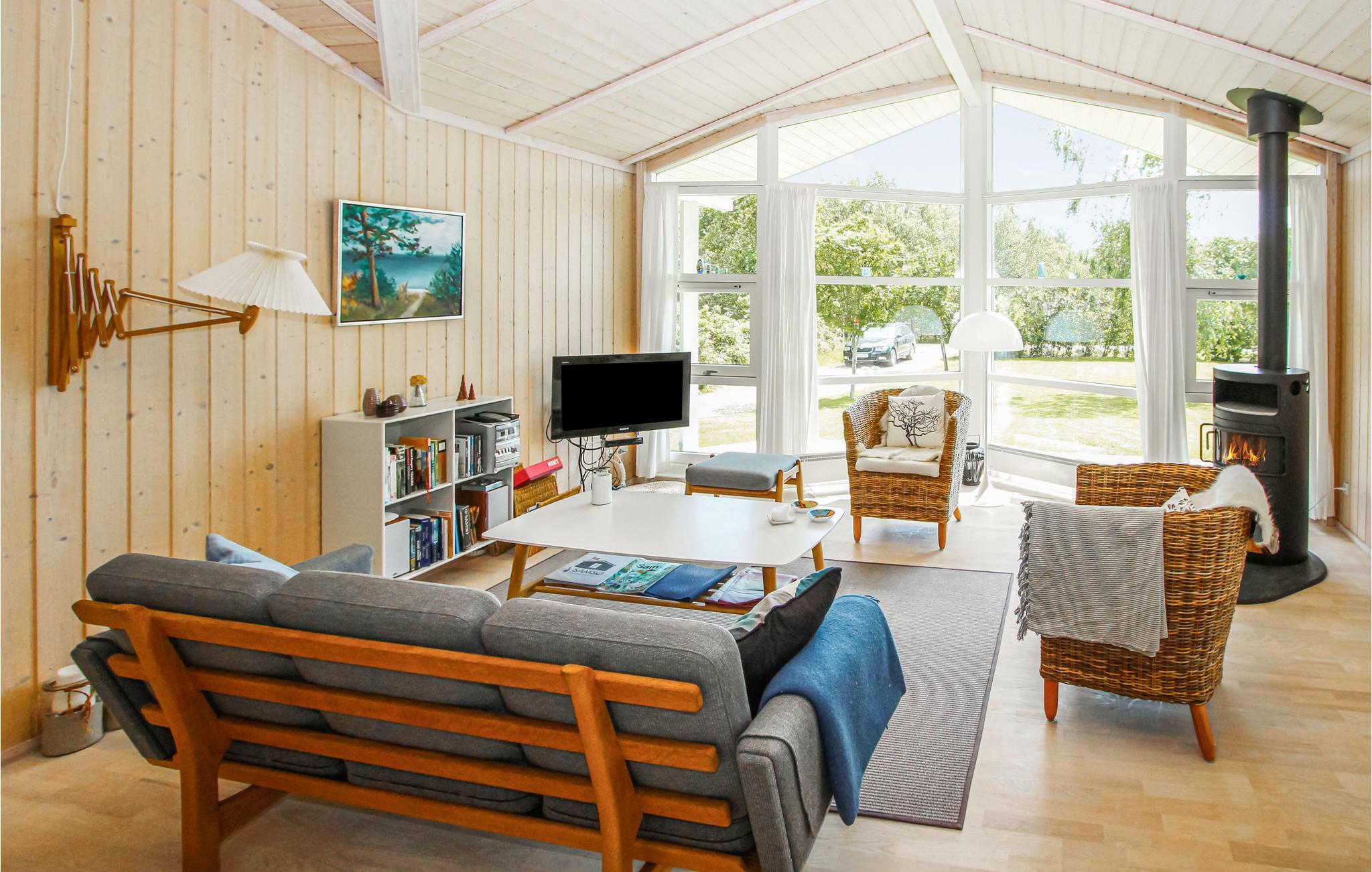 I dette lyse og hyggelige hus er der tænkt på både store og små gæsters behov, og her er ideelle betingelser for en ubekymret ferie med familien. Her mødes klassisk sommerhuscharme med moderne indretning, nyd masser af dagslys i opholdsstuen takket være det store vindue, og gå direkte ud på terrassen herfra. Børnene vil elske at løbe rundt i det fri, og I kan altid have dem i syne inde fra huset og fra terrassen.