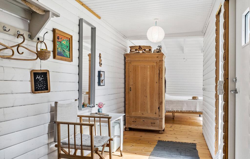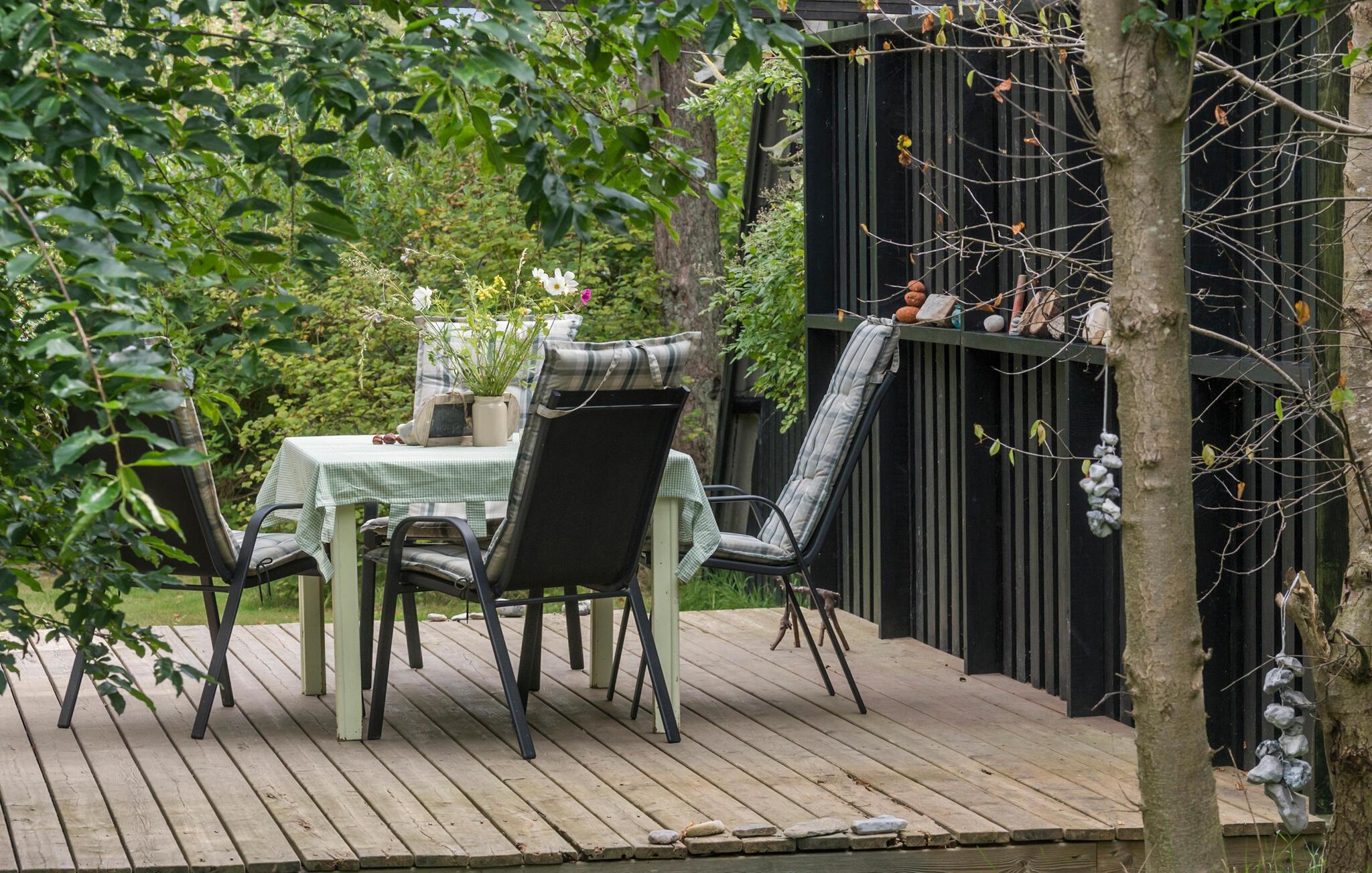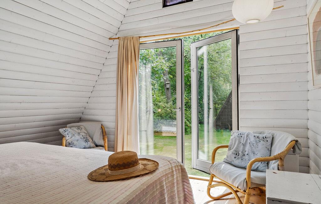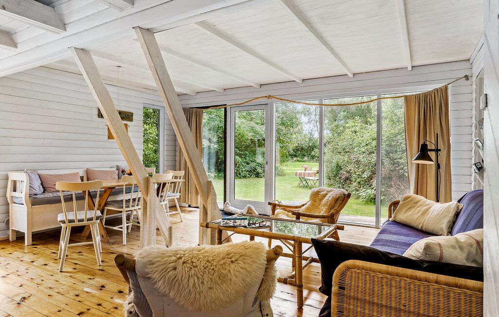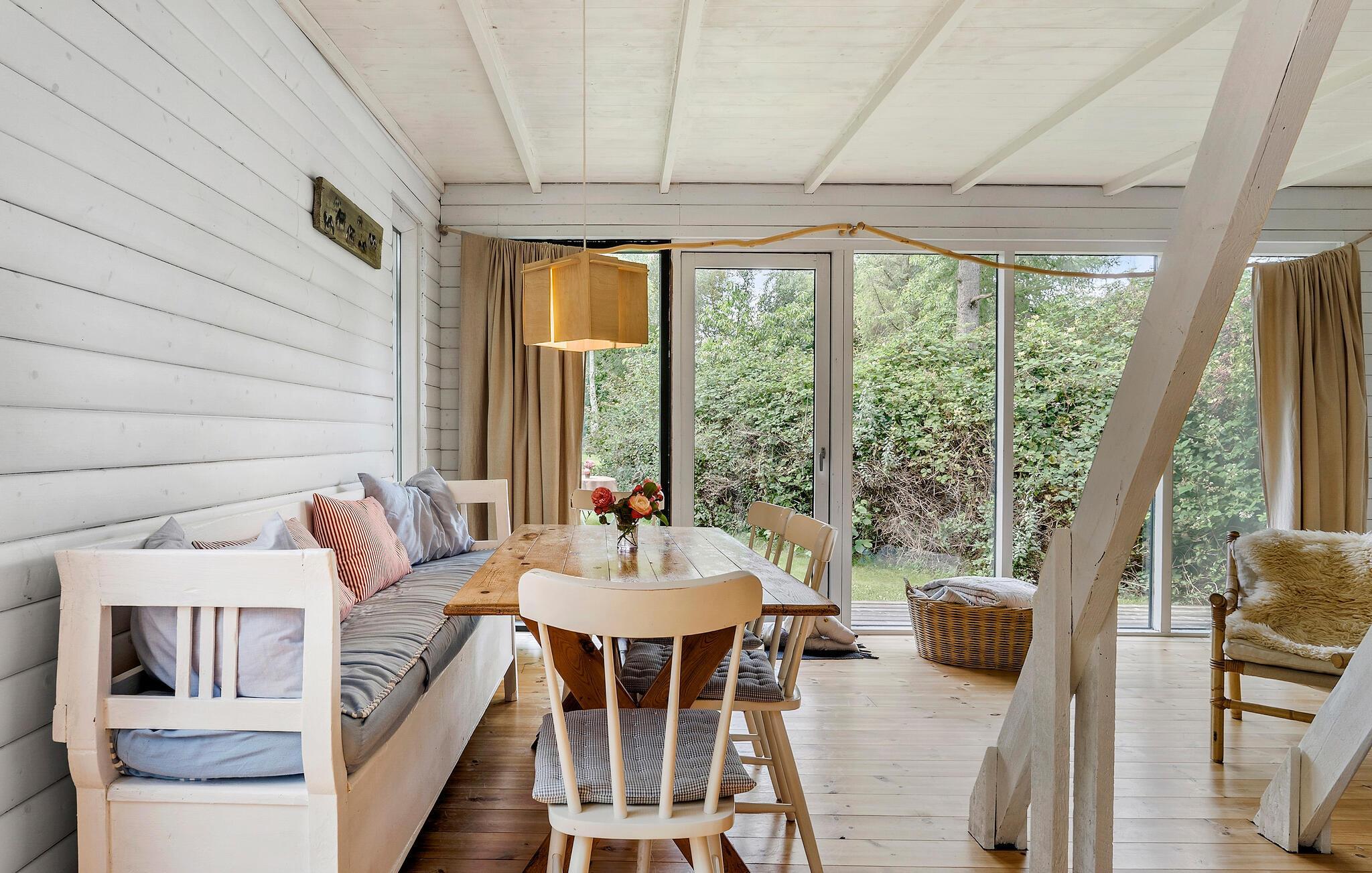 Sæt det travle liv på pause og nyd freden og roen på denne skønne grund! Især det store opholdsrum har en skøn kontakt til de grønne rammer udenfor. Sæt jer til rette med bøger og brætspil efter dagens udflugter og nyd udsigten i stuen, hvor ude og inde næsten smelter sammen. De hvide trævægge skaber et dejligt lys, også til dagens måltider, hvor I kan beslutte jer for, hvad jeres næste eventyr skal være.