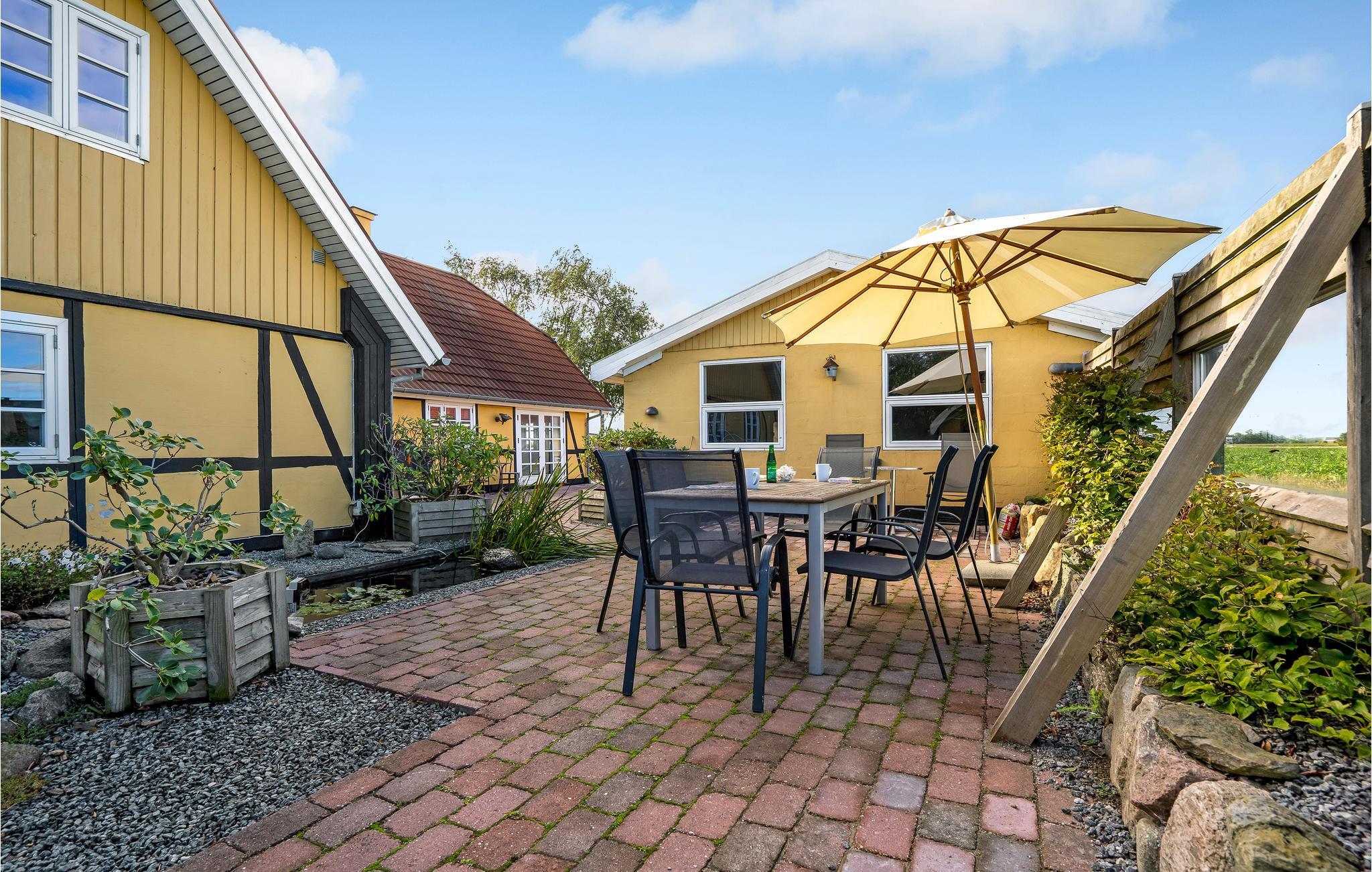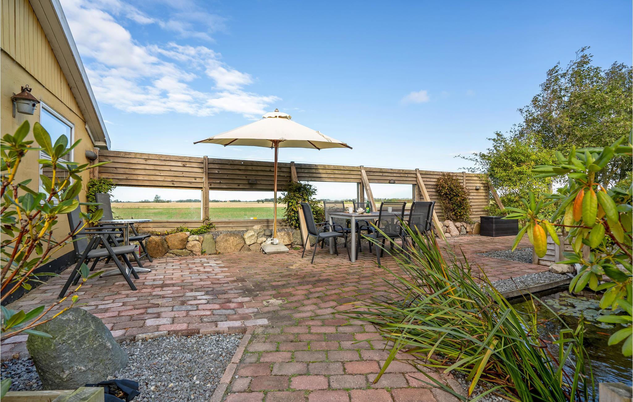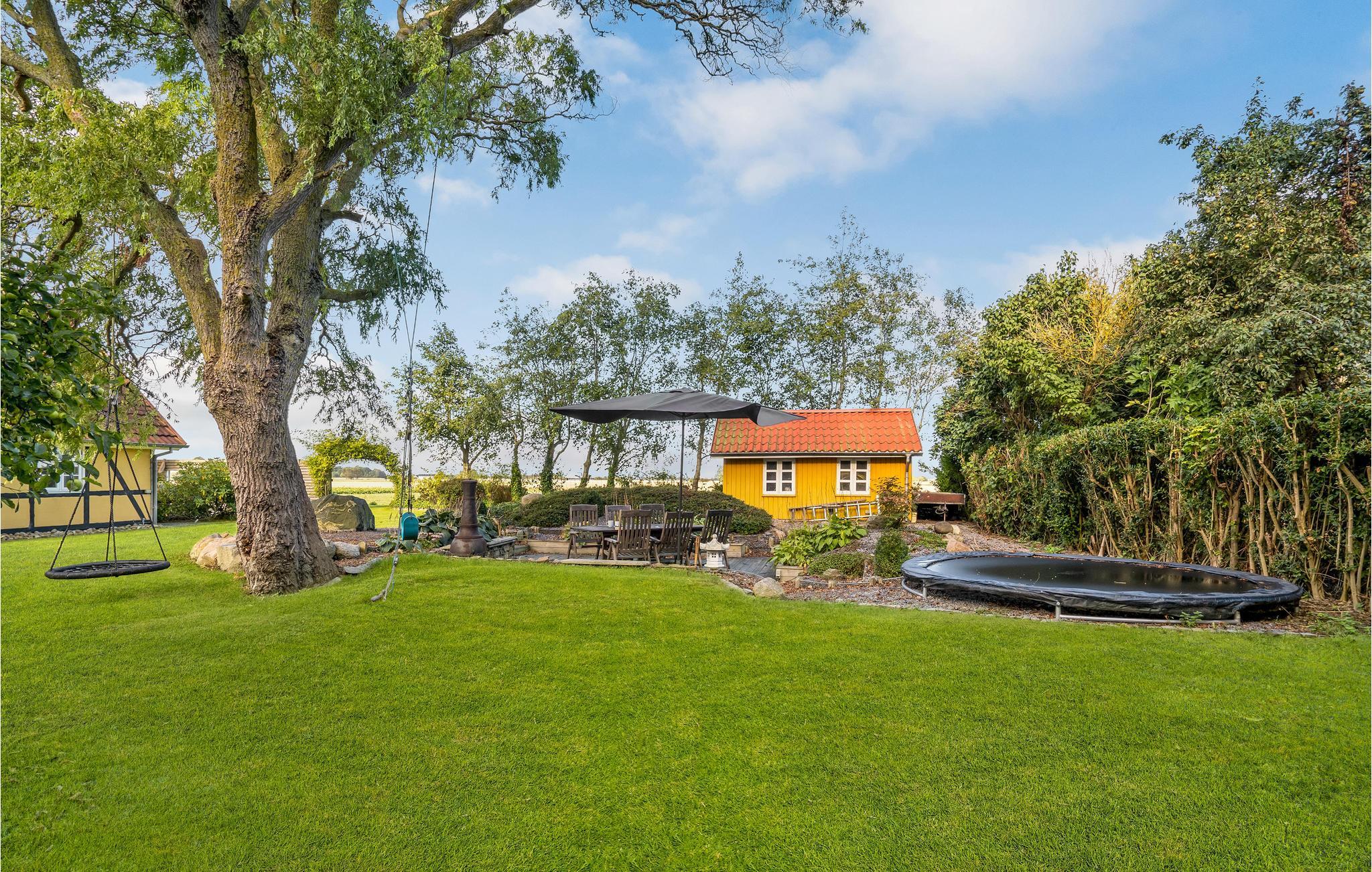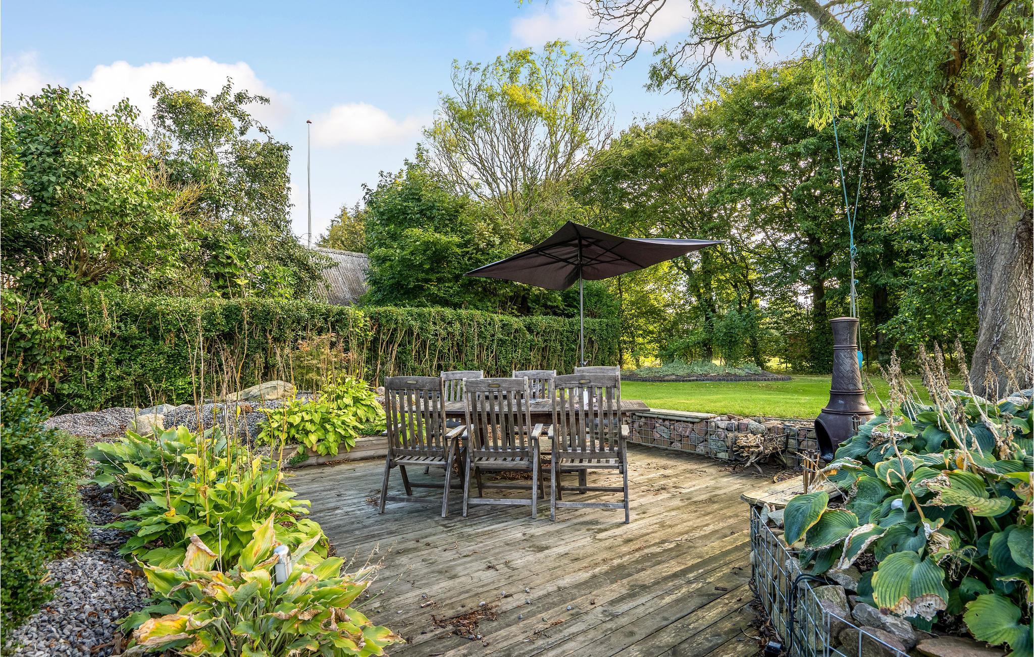 Den velholdte have består af blomsterbede, terrasser, gamle træer og græsplæne, så der er gode rammer til børnenes leg og en skøn oase til forældrene. Terrassen ligger dejligt i læ og har udsigt til de omkringliggende marker.