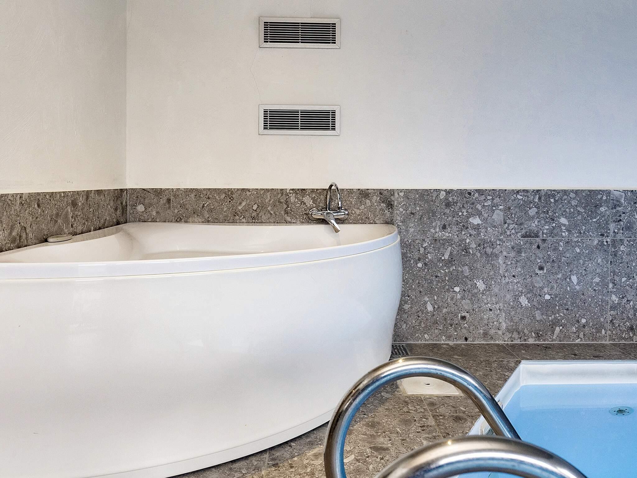 Der er to badeværelser med bruseniche gulvvarme. I saunaen er der mulighed for afslapning.