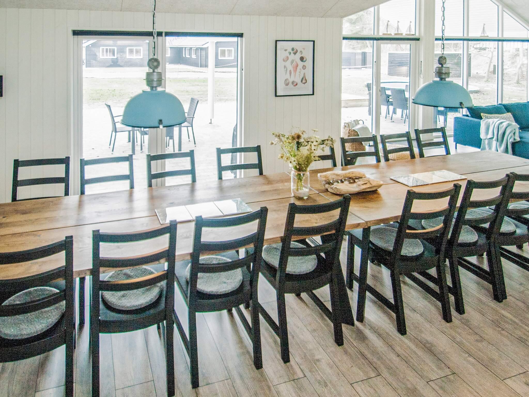 Sovepladserne er fordelt på syv dobbeltværelser og en hems med fire ekstrasenge. Der er en delvist overdækket terrasse, hvor maden kan tilberedes på grillen og der er god plads til at alle kan hygge sig sammen.