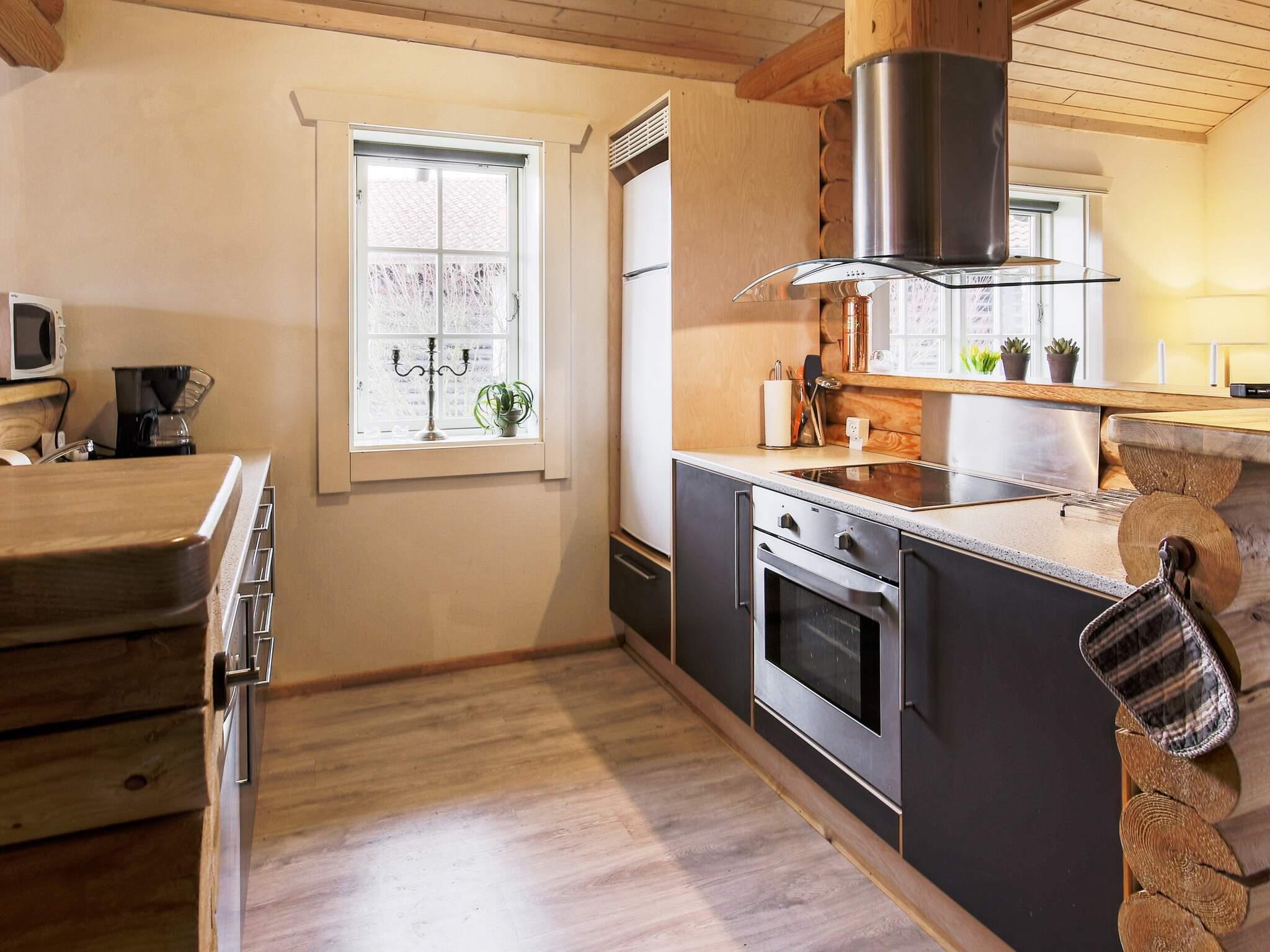 Det lyse køkken er fuldt udstyret med køleskab, fryser (40 L kapacitet), keramisk kogeplade, mikroovn og opvaskemaskine. Det er åbent forbundet med den rummelige stue, som skaber et indbydende rum til madlavning, spisning og afslapning sammen. Herfra har du adgang til terrassen, inklusive et overdækket areal på 10 m², perfekt til udendørs måltider. Der er havegrill, og naturgrunden på 370 m² giver masser af plads til at nyde den friske luft.
