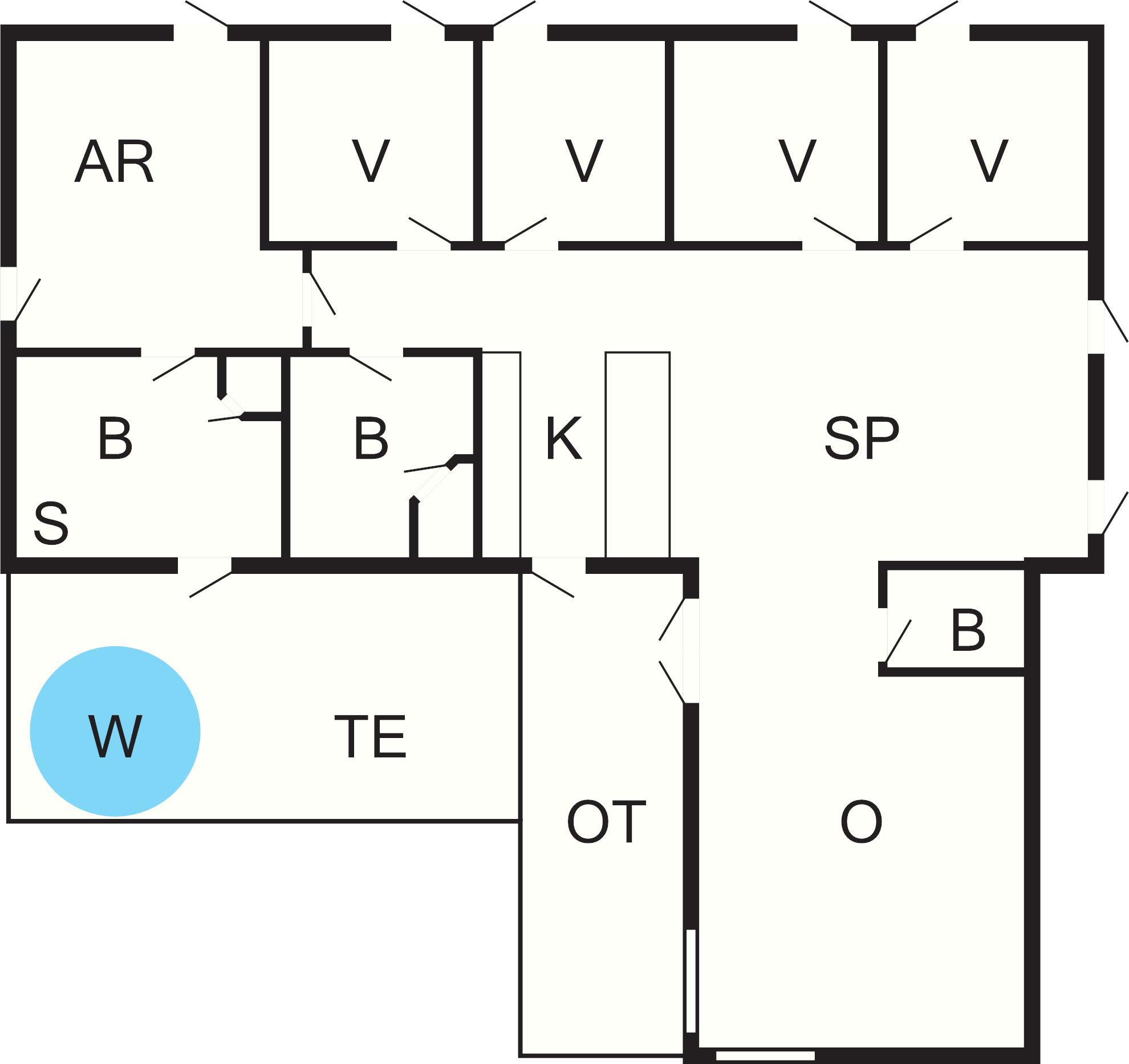 Der er fire soveværelser med dobbeltsenge (180 cm), eget klædeskab og direkte udgang til den store træterrasse, samt tre hemse med hver to enkeltsenge. Huset har to badeværelser, et ekstra toilet, vaskemaskine, tørretumbler og gulvvarme overalt via energivenlig luft/vand varmepumpe. Fra terrasserne kan solen nydes hele dagen – syd- og vestvendte områder med grill og overdækkede hyggekroge med terrassevarmere, samt en østvendt terrasse til morgenkaffen. På den store naturgrund er der fodboldmål, rig plads til leg og to elbilopladere (type 2).