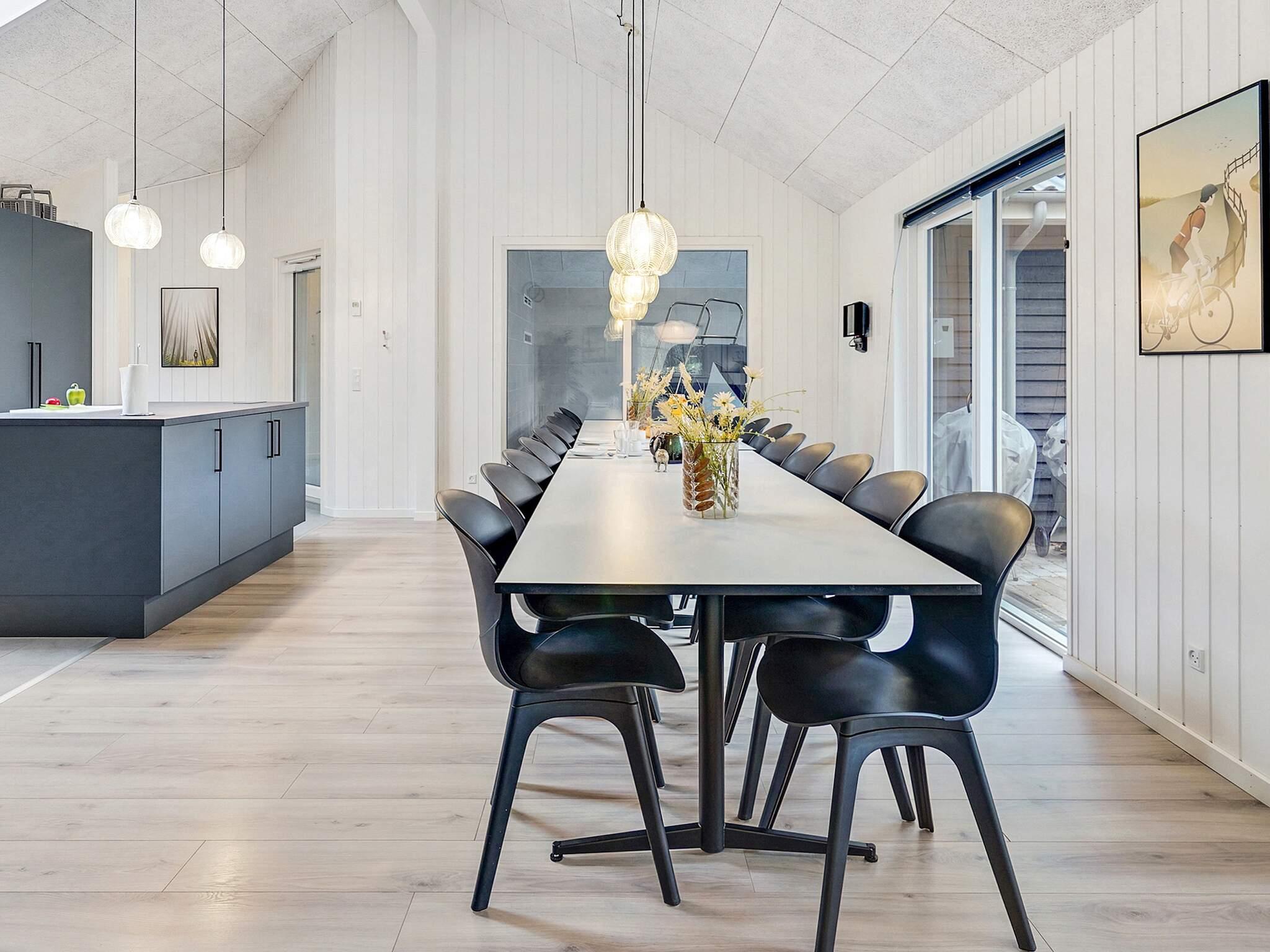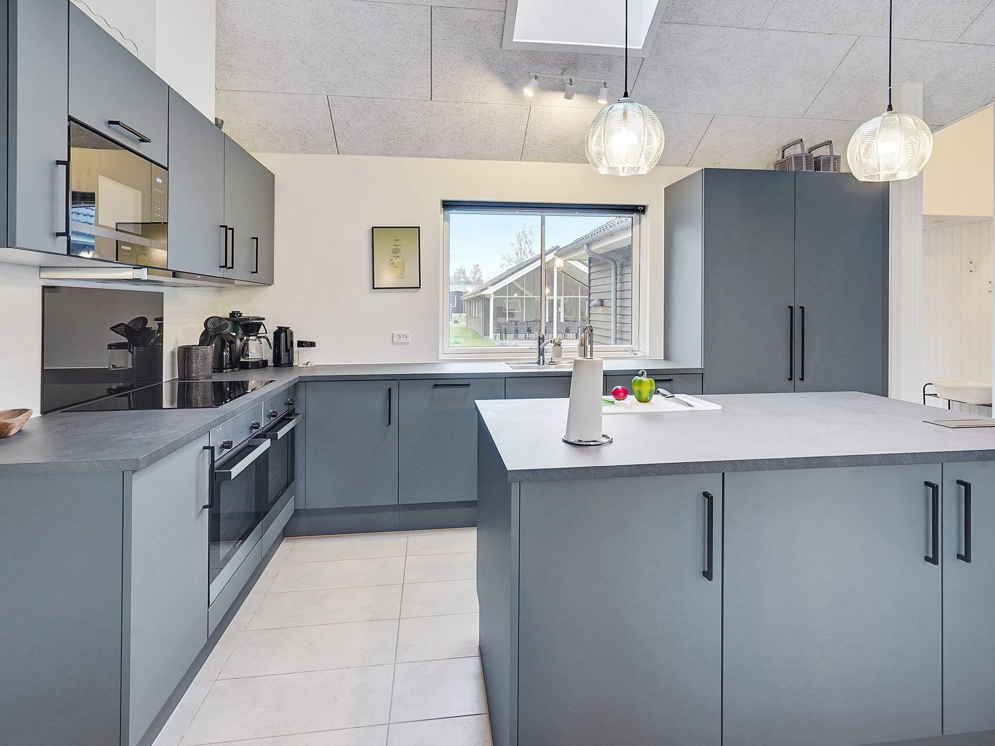 Fra entréen kommer man ind i køkken-alrummet, som er centrum i sommerhuset. Her er der højt til loftet og god plads omkring spisebordet, så alle kan samles. Selve køkkenet er også veludstyret med dobbelt ovn, køleskab, opvaskemaskine og ekstra kogeplader. I værelset finder I desuden en sofagruppe tæt på sommerhusets brændeovn, som kan sprede en hyggelig varme på kølige dage.