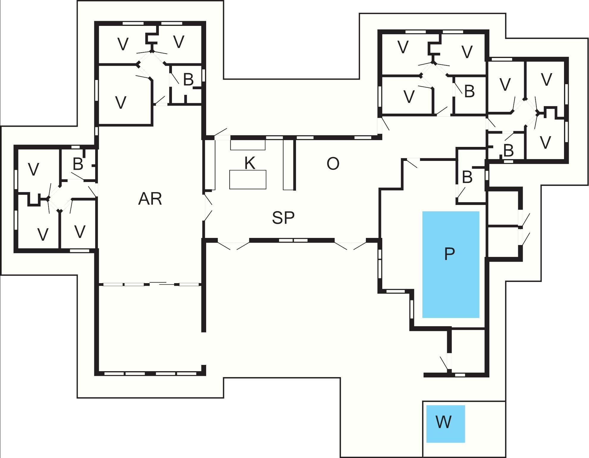 Sommerhusets 12 senge er fordelt på seks dobbeltværelser, og der er fire ekstra senge på hemsen. Hver sektion har sit eget badeværelse, for ikke at nævne det fælles badeværelse i poolområdet.
