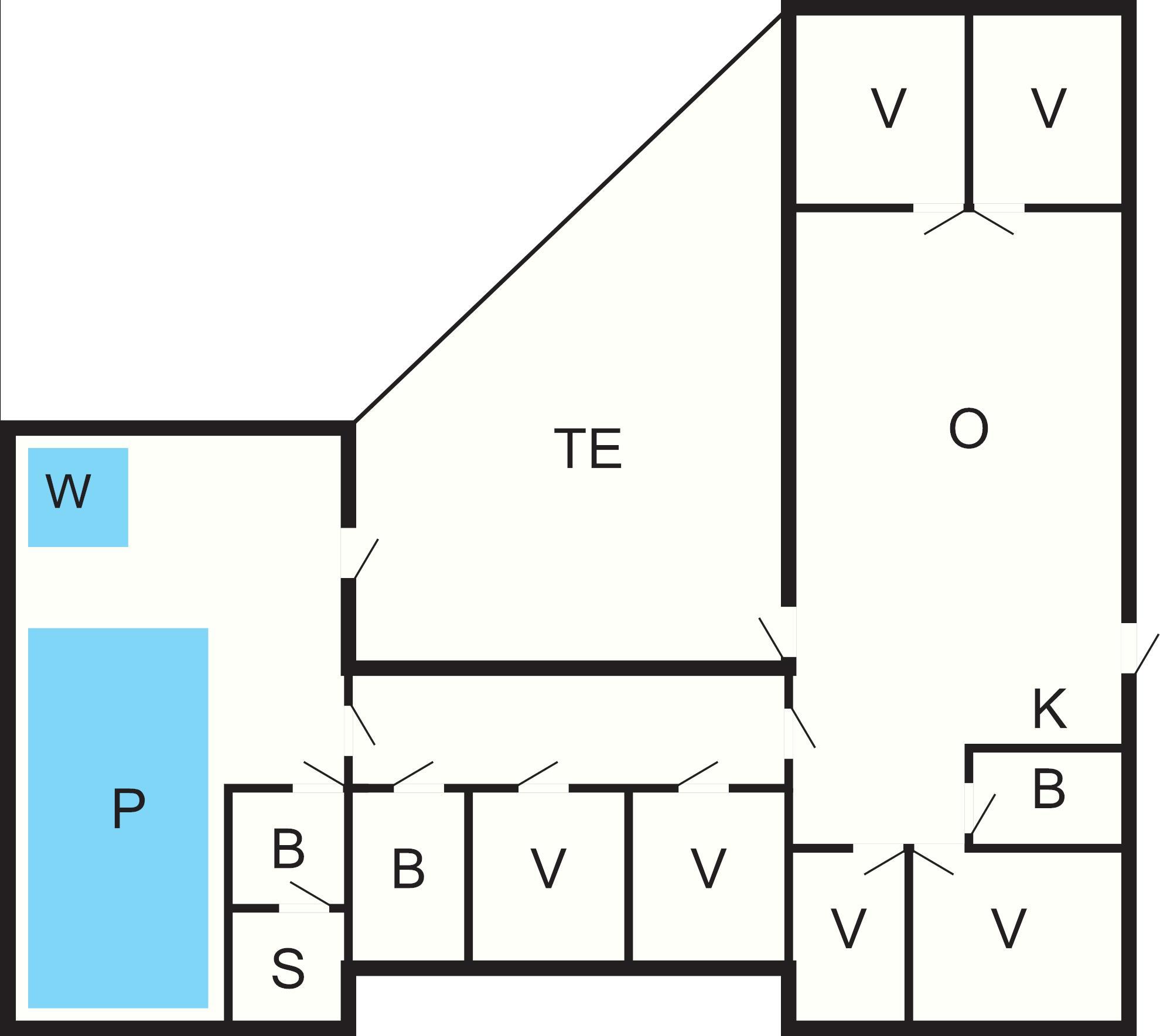 6 Soveværelser: (1DS)+(1DS)+(1DS)+(1DS+1K)+(1DS+1K)+(2S), barneseng