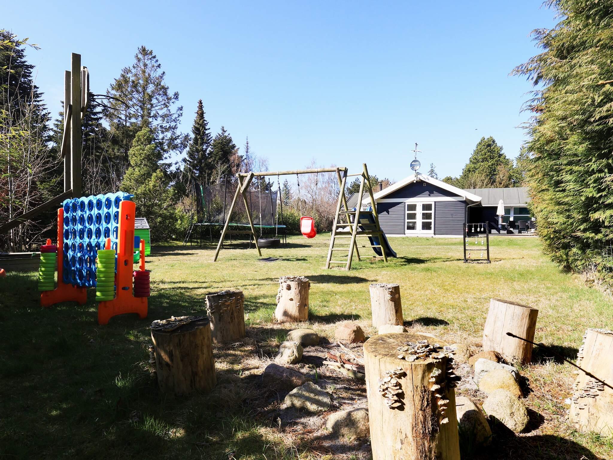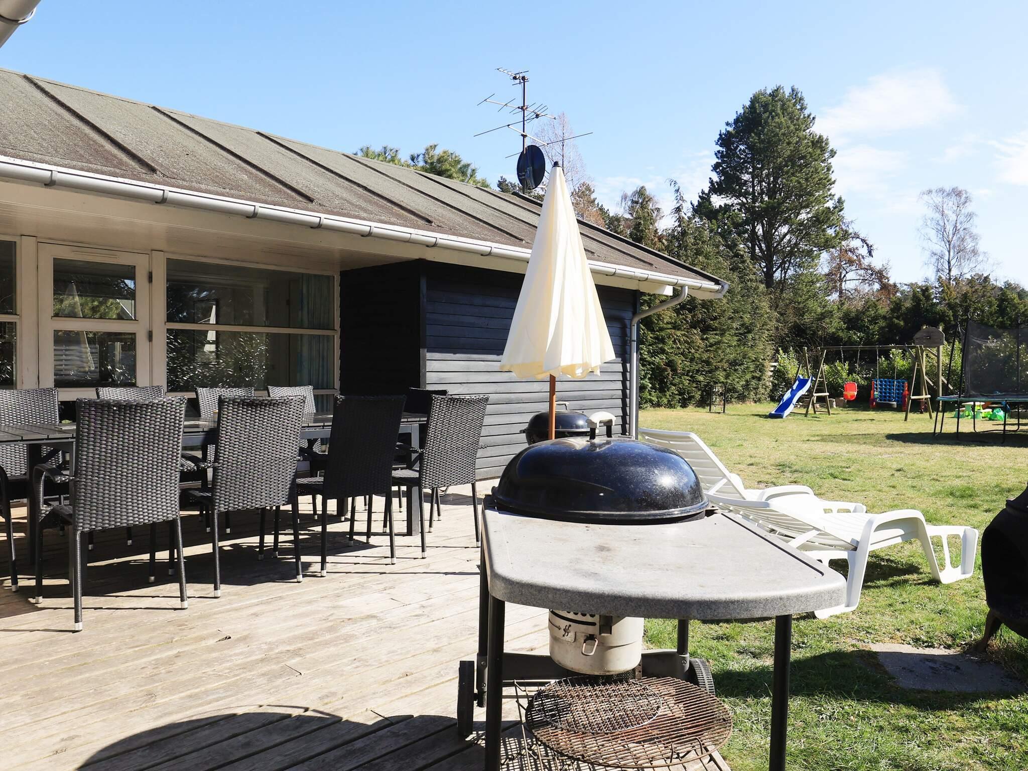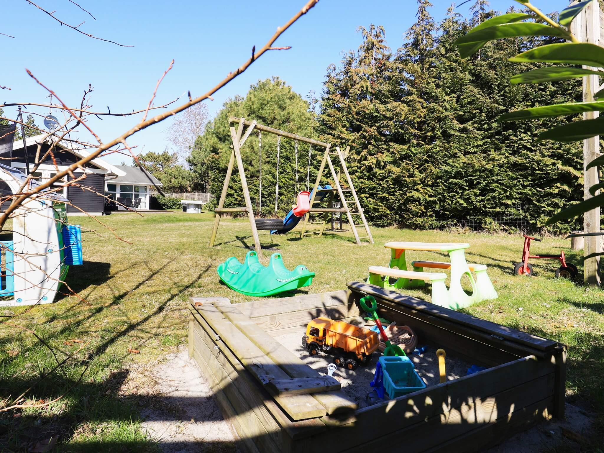 Den store have er indhegnet og tilskynder til leg og leg med en gynge, legeret, sandkasse og bordtennisbord. Haven har både åben og overdækket terrasse med havemøbler, liggestole, udendørs pejs og kulgrill.