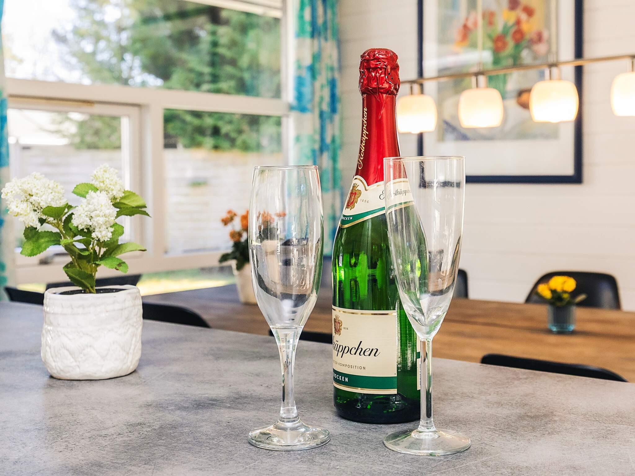 Køkkenet, som indeholder kaffemaskine, el-komfur med ovn, mikroovn, køleskab med fryseboks og opvaskemaskine, er renoveret i 2024. Det åbne køkken leder direkte ind i spisepladsen. I stuen er der brændeovn og varmepumpe, samt tv med parabol (digital), dvd-afspiller, musikanlæg med cd-afspiller og internet.