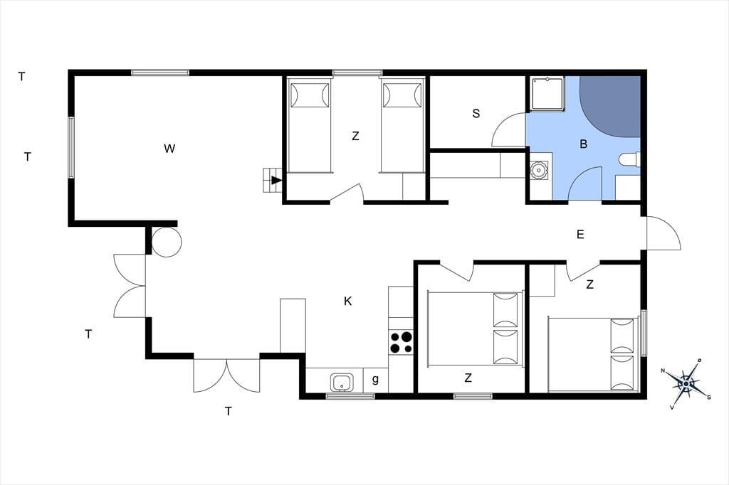 Feriehuset byder på 3 gode soveværelser og en hems med 2 madrasser. 1 stort rummeligt badeværelse som indeholder bruser, WC, spabad og sauna. Derudover husets hjerte, som er det skønne køkken-alrum, som indeholder et åbent køkken, en spiseafdeling nær køkkenet, samt en stue og sofaafdeling i den anden ende. Fra stuen er der ligeledes udgang til terrassen, hvorfra der er udsigt til grønne fællesarealer.