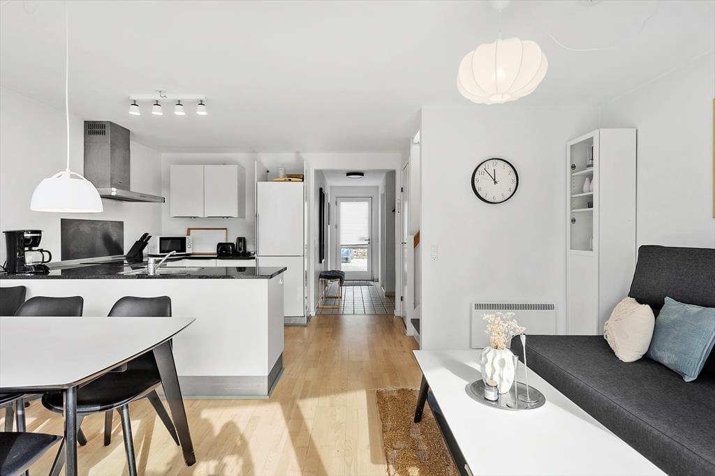 Ferielejligheden er indrettet med entré med adgang til badeværelse med WC, håndvask og bruseniche, og til et soveværelse med en dobbeltseng og skabsplads. For enden af entréen kommer man ind til husets flotte og lyse køkken-alrum, hvor køkkenafdelingen indeholder alt hvad hjertet begærer, mens resten af rummet indeholder et spisebord med stole og en sovesofa. Fra køkken-alrummet er der også udgang til lejlighedens skønne terrasse.