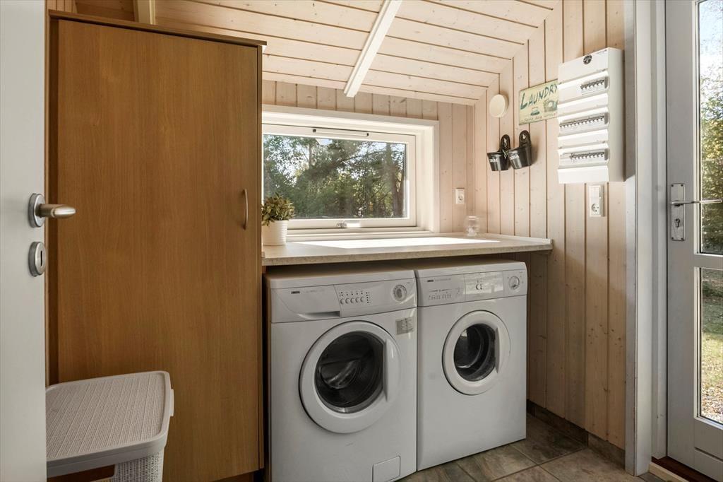 Her finder I en rummelig entré med både vaskemaskine og tørretumbler, fire velindrettede soveværelser – tre med dobbeltsenge og ét med to enkeltsenge – så der er god plads til alle. De to badeværelser gør hverdagen nem, og det ene byder endda på både spabad og sauna – perfekt til ren afslapning efter en dag ved stranden.