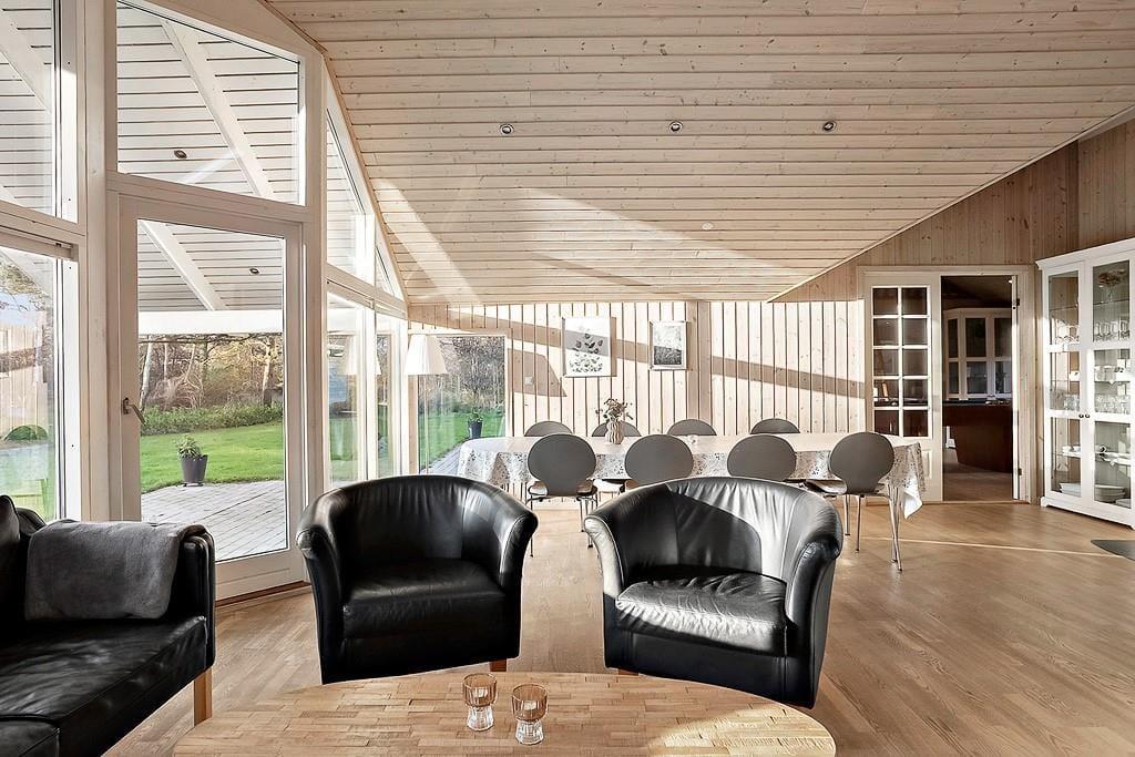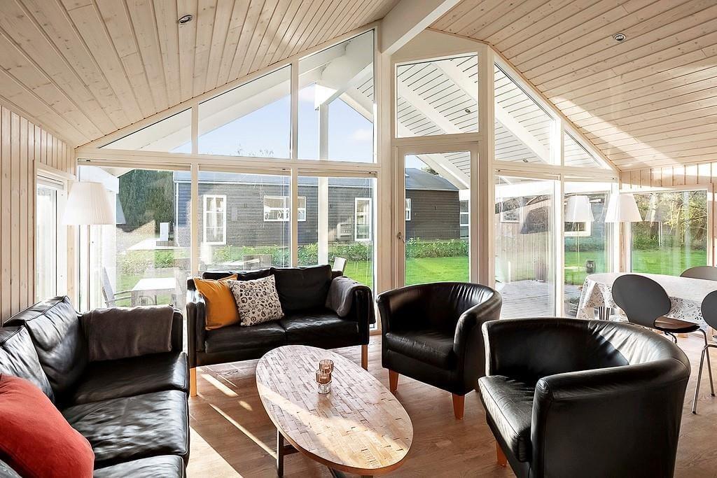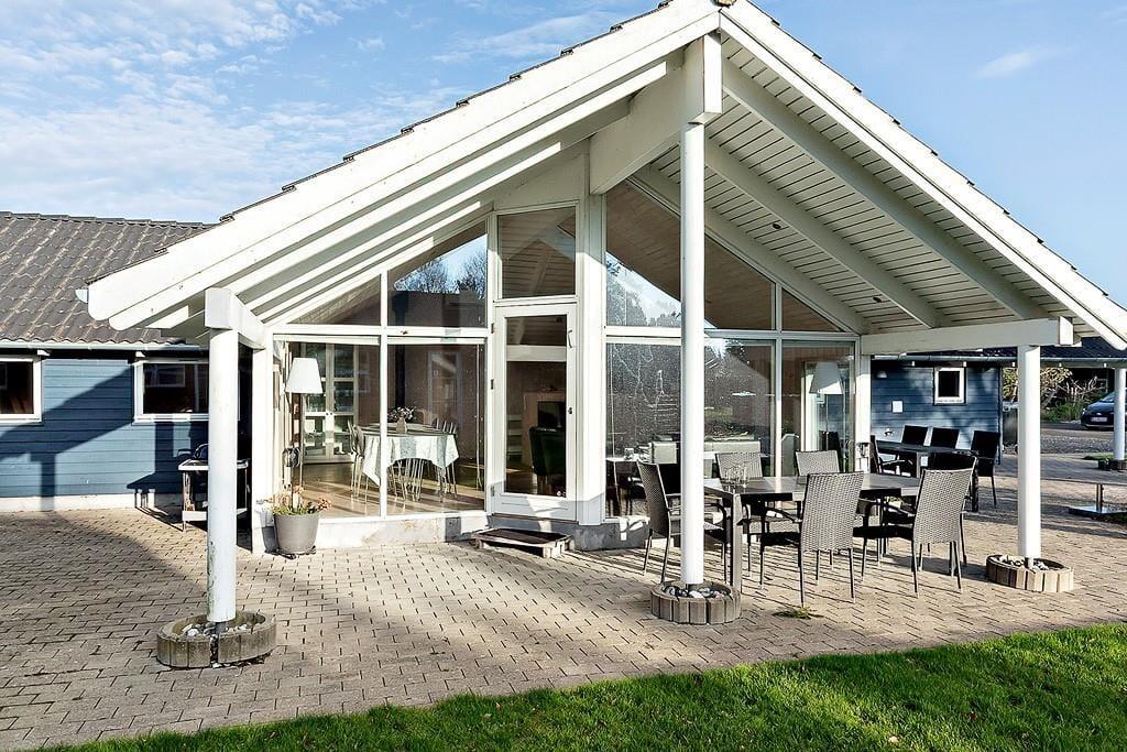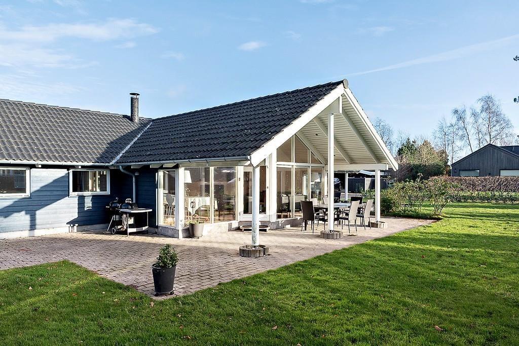 Fra stuen af kan man komme ud på den delvist overdækket terrasse hvor man kan nyde en god frokost i eftermiddagssolen.