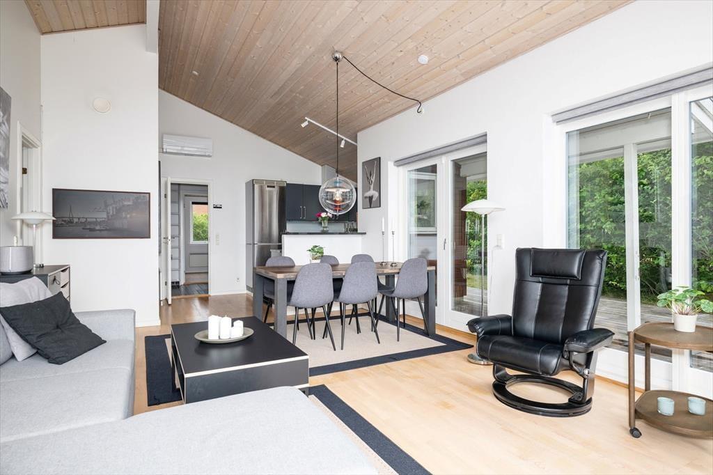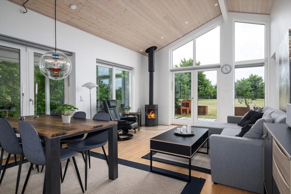 Indendørs mødes I af et stort, smukt vinduesparti, der giver et fantastisk lysindfald og en skøn fornemmelse af at trække haven og naturen helt ind i stuen. Her er højt til loftet og en lys, moderne indretning, som skaber de perfekte rammer for en afslappende ferie.