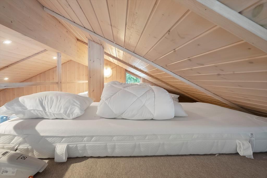 Huset rummer 2 gode soveværelser med dobbeltseng samt en hyggelig hems med 2 madrasser, som er perfekt til børn eller ekstra overnattende gæster. Her er plads til både familie og nære venner.