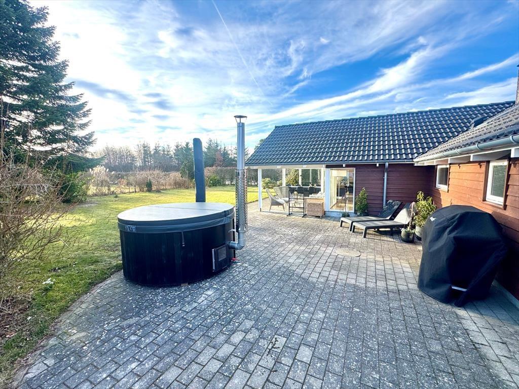 Udenfor tilbydes en god have samt terrasse med havemøbler og et vildmarksbad.