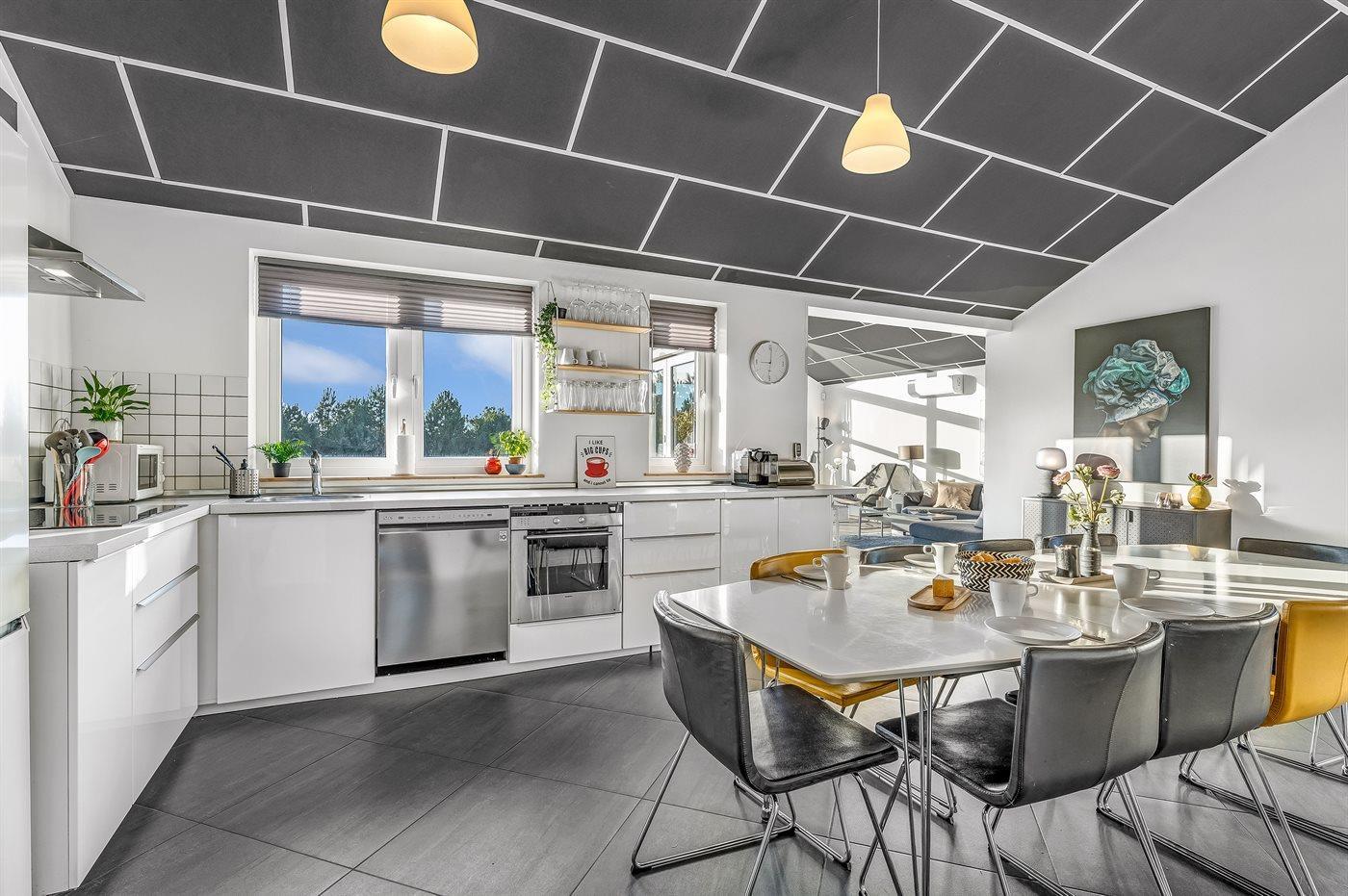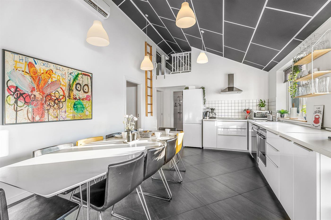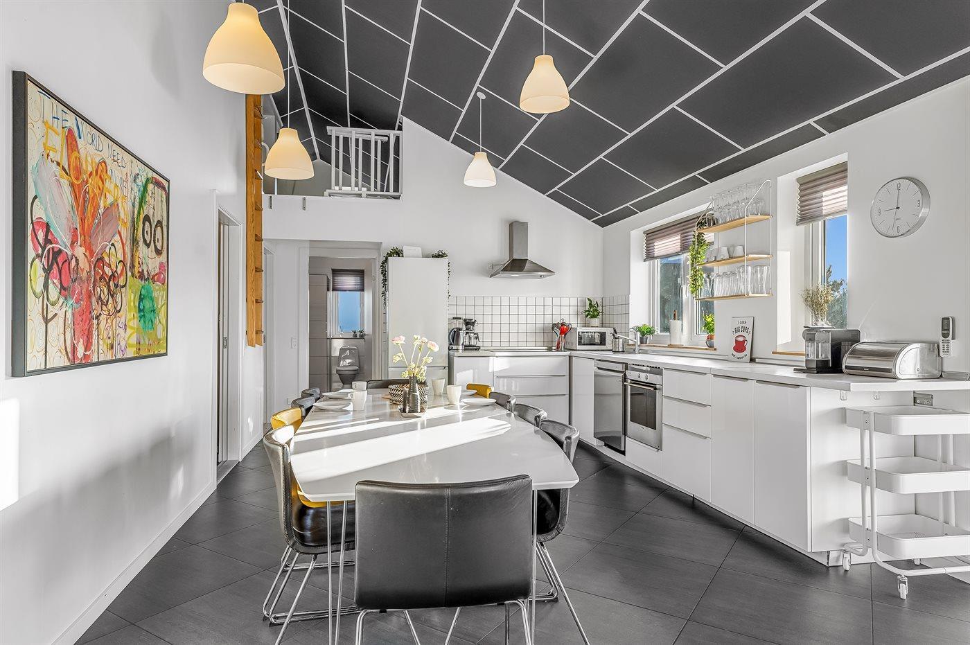 Køkkenet er udstyret med 1 køleskab. Der er 4 induktionskogeplader, varmluftovn, mikrobølgeovn samt opvaskemaskine.