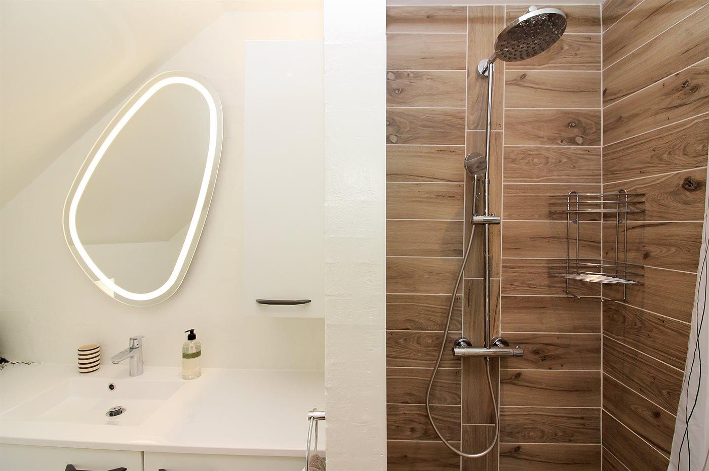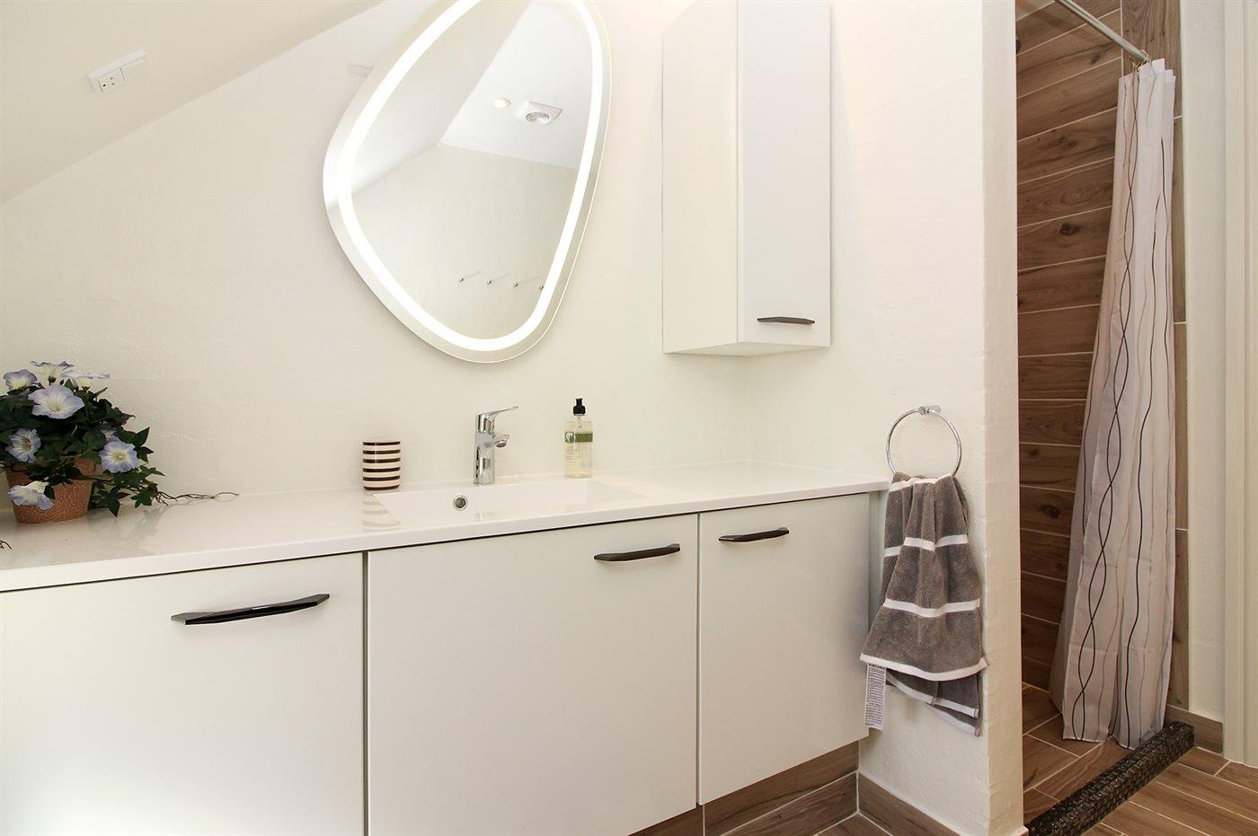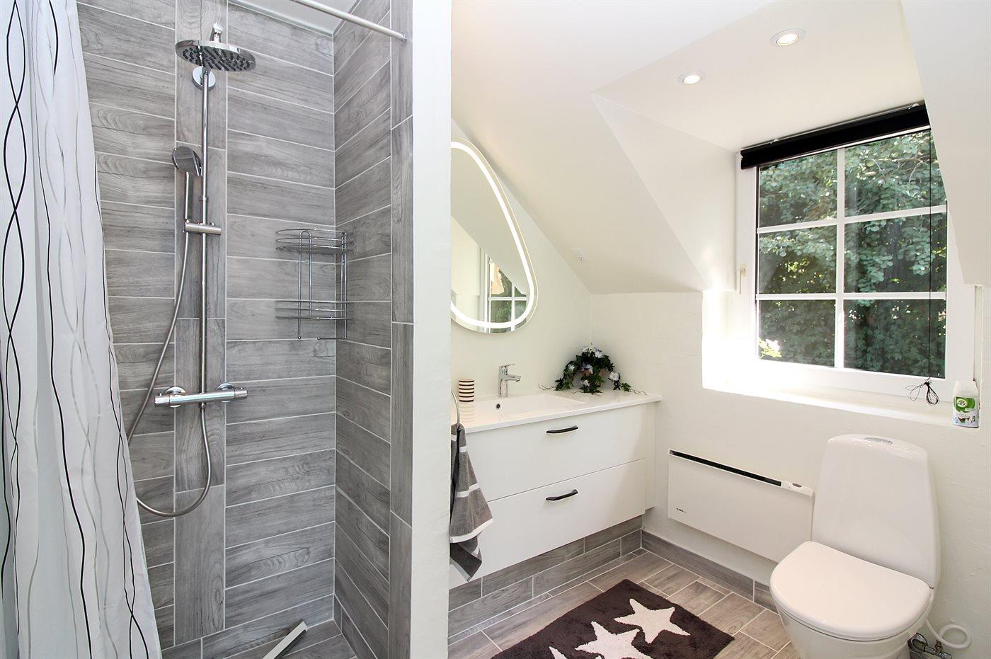 Der er 2 badeværelser med bruseniche og 2 toiletter. Der er gulvvarme på 2 badeværelser. I saunaen er der mulighed for afslapning.