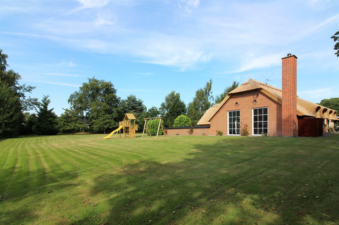 Ferieboligen er beliggende på en 2750 m² stor havegrund. Der er 250 m til havet. Nærmeste forretning er beliggende i en afstand af 1000 m. Til ferieboligen hører 65 m² terrasseareal. Heraf i alt 65 m² lukket terrasse. Gynge. Legetårn. Rutchebane. Fodboldmål. (2 stk. 5-mands-mål). Der er 2 grill til rådighed. Der er installeret stik til opladning af elbil. Type 2 stik. Med 11 kW ladeeffekt. Parkering ved ferieboligen.