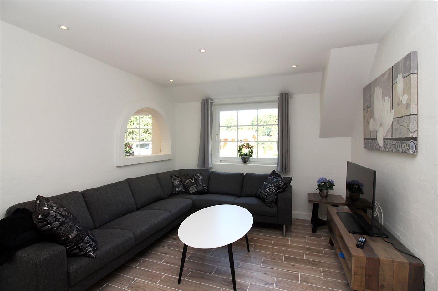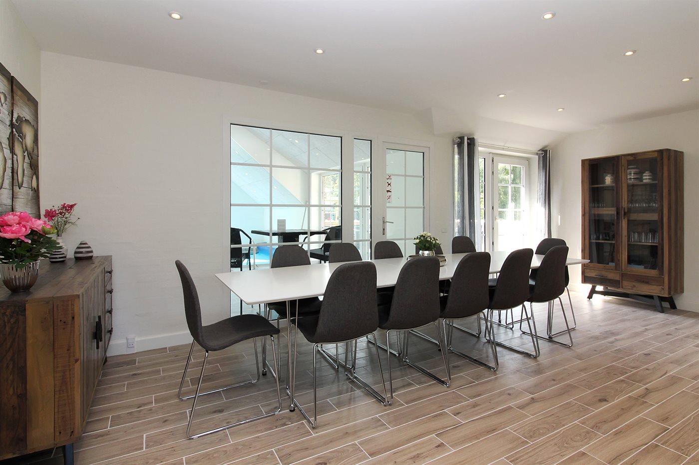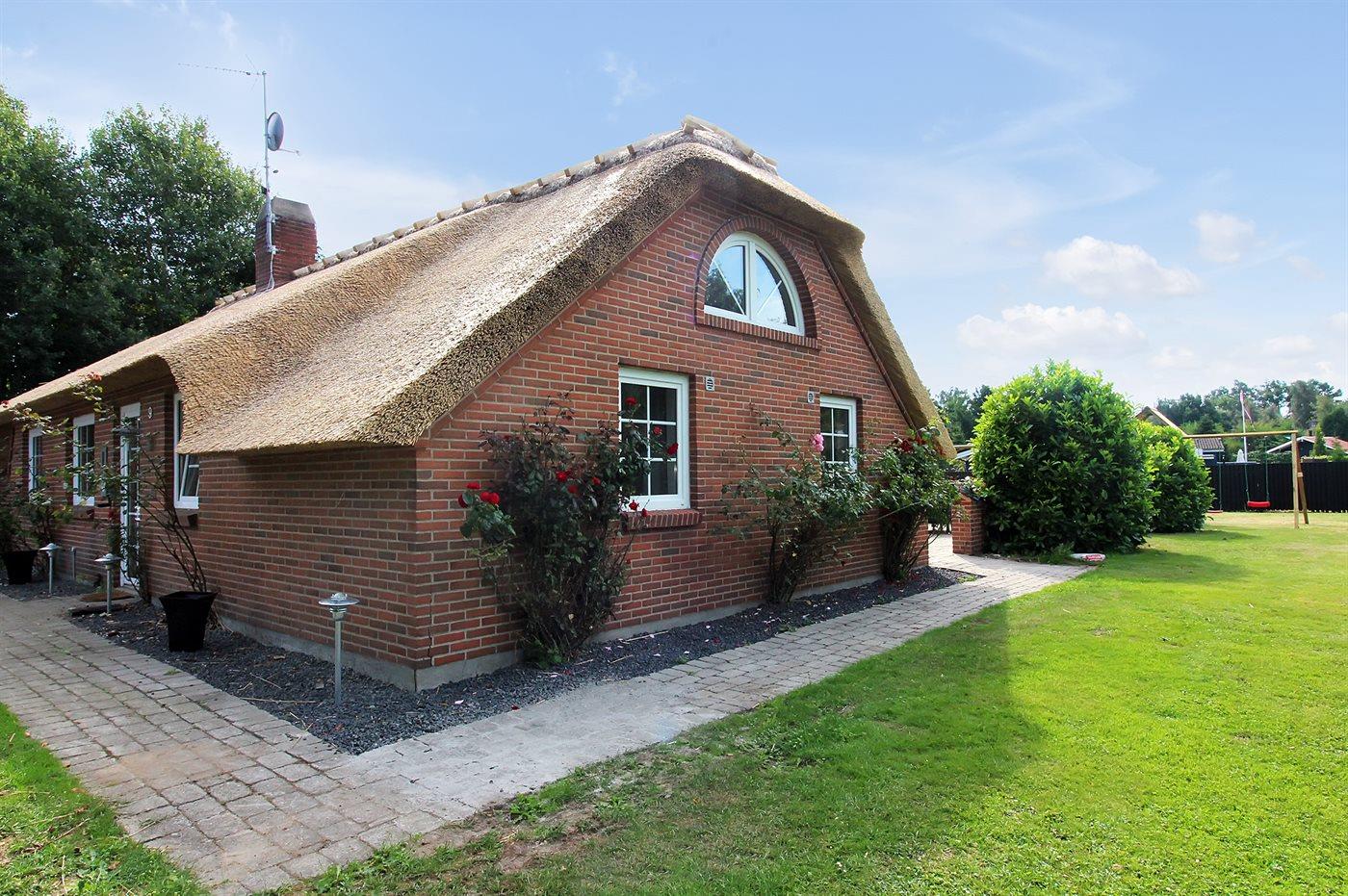 Flot renoveret sommerhus med indendørs pool, spa og stor lukket have nær børnevenlig strand.