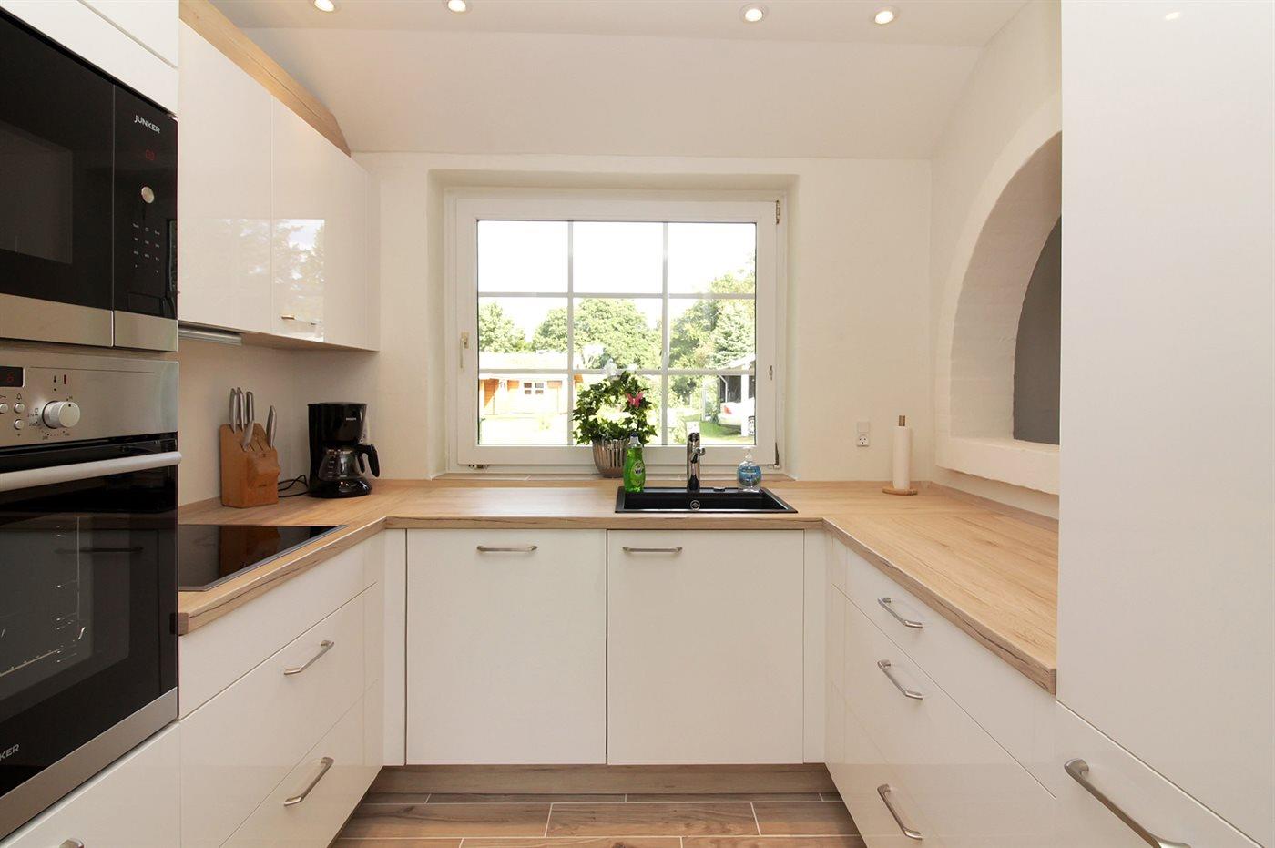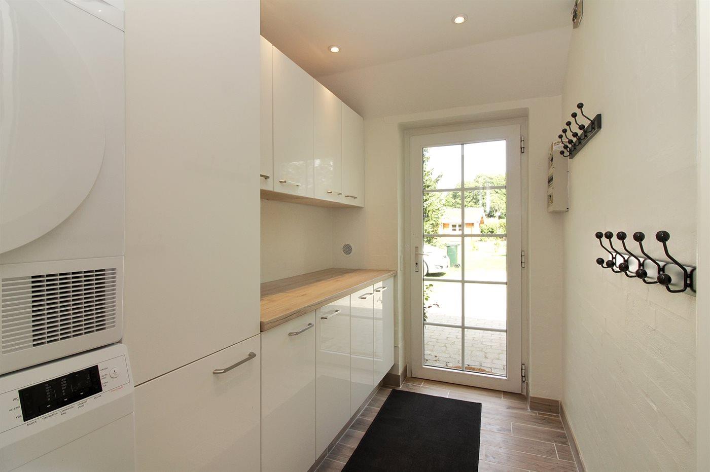 Køkkenet er udstyret med 1 køleskab. Der er 5 keramiske kogeplader, varmluftovn, mikrobølgeovn samt opvaskemaskine Der er gulvvarme i køkkenet.