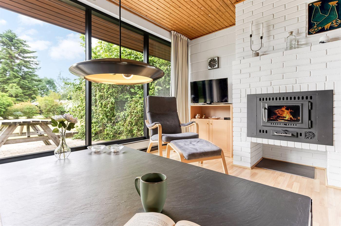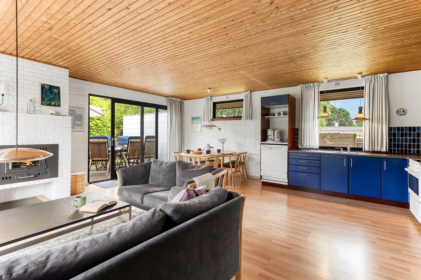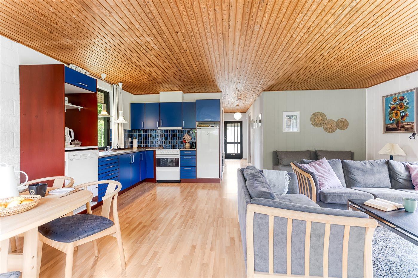 Der findes kombineret køkken og opholdsstue, hvor der er god plads til fælles madlavning og hyggeligt samvær. Sovepladserne fordeler sig på 2 soveværelser, hvoraf det ene er indrettet med dobbeltseng og det andet med køjeseng. Desuden findes der en dobbelt sovesofa i opholdsstuen.