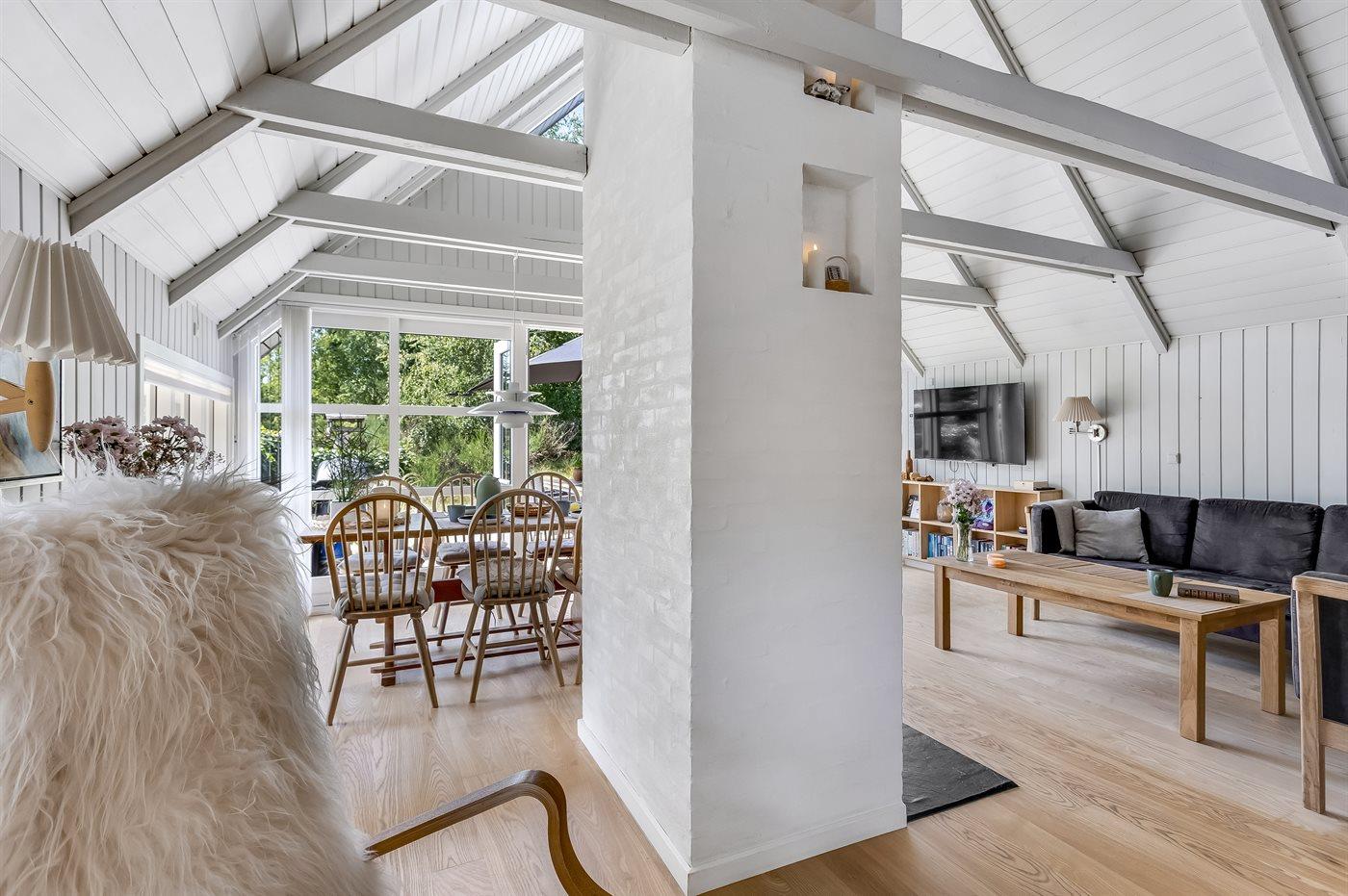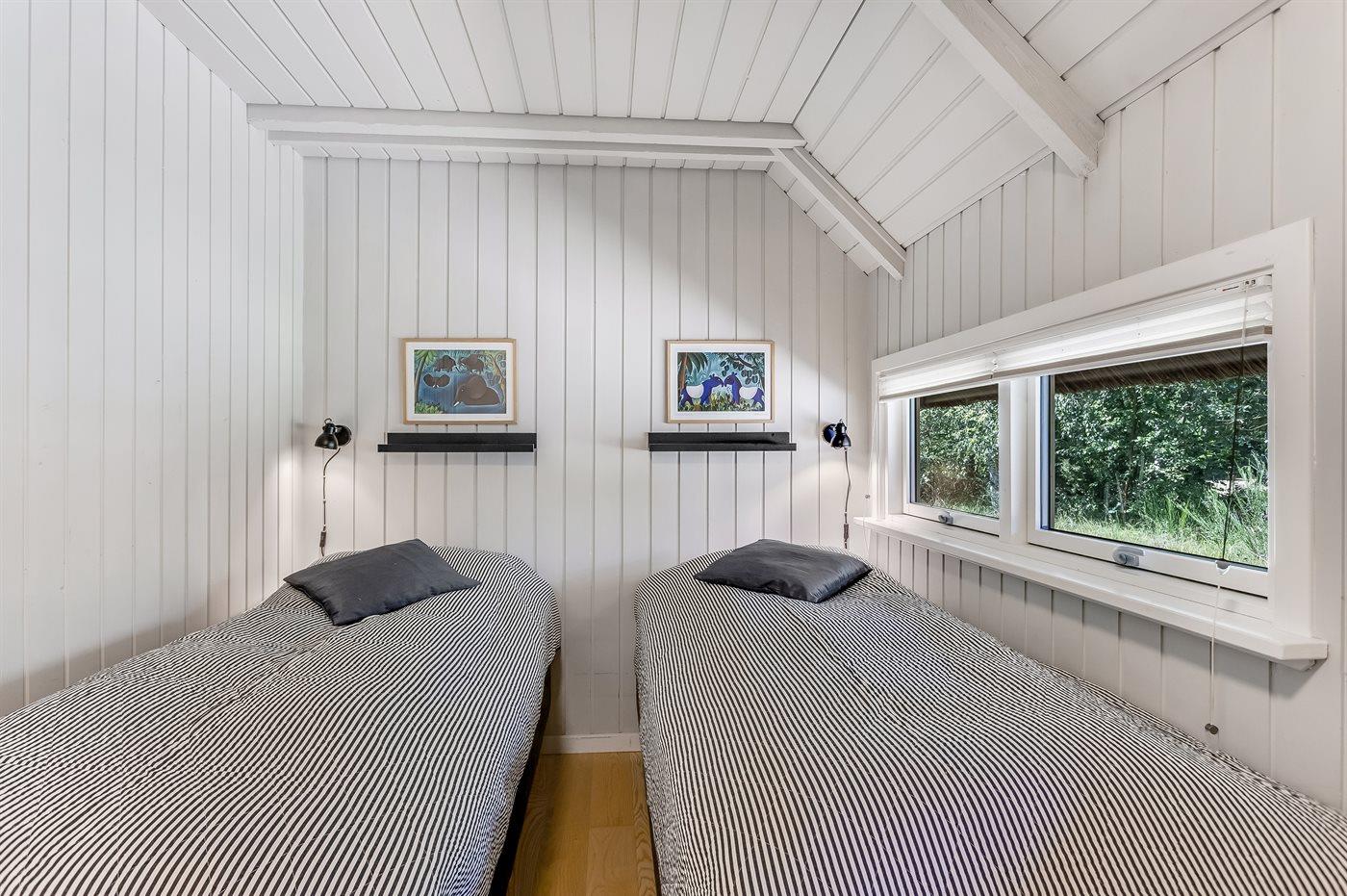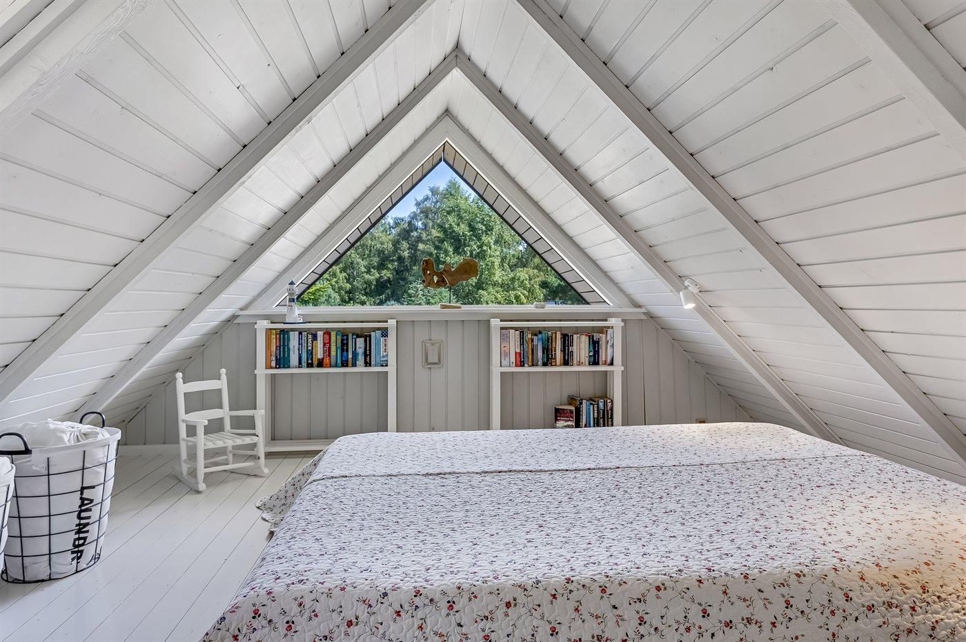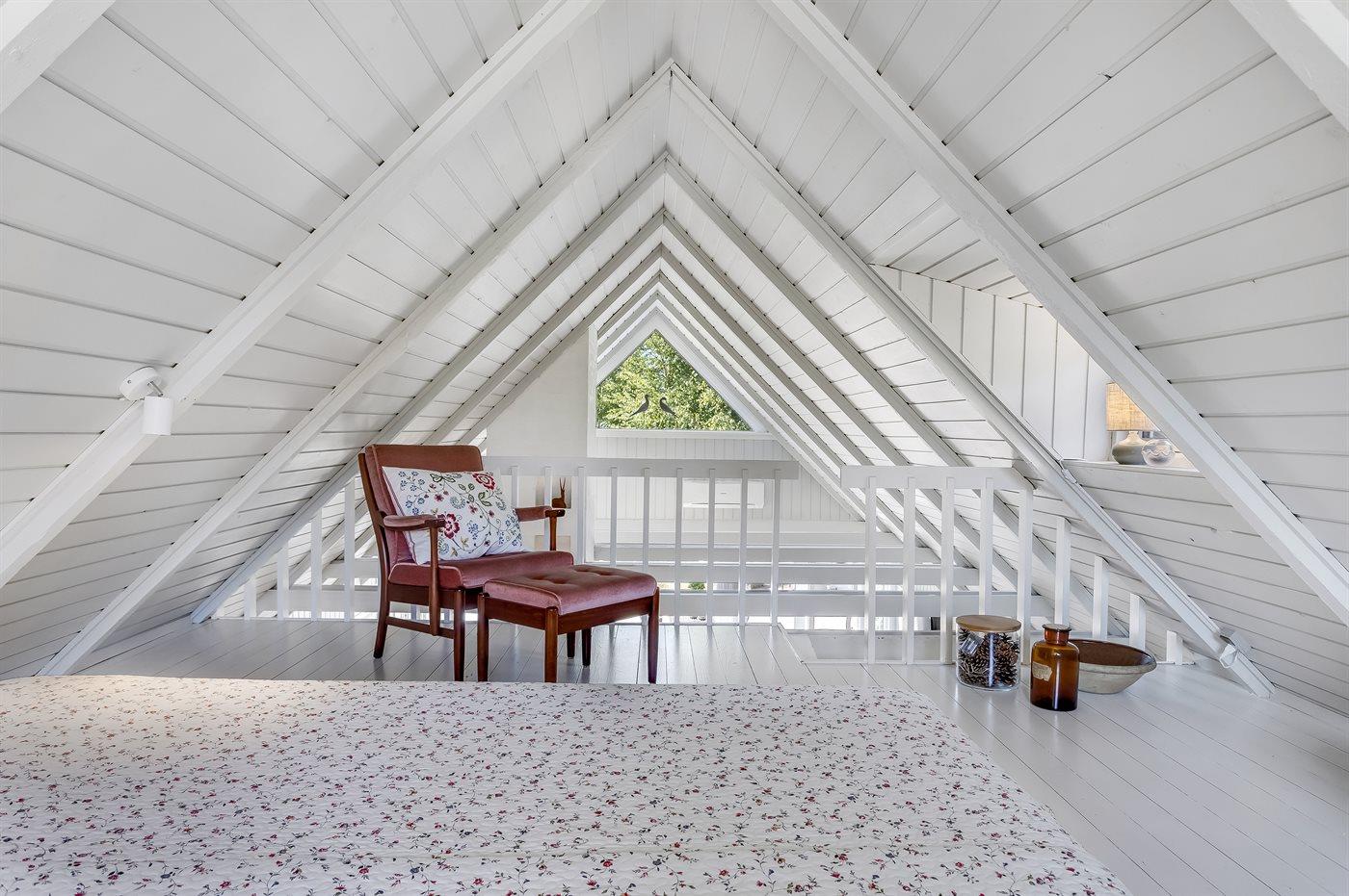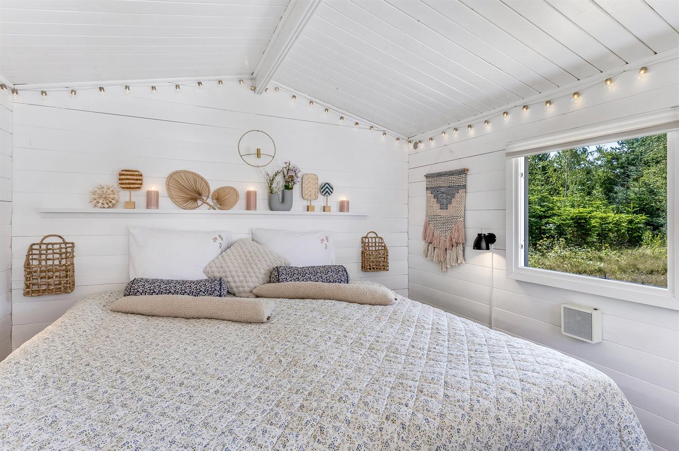 Fra stuen går en lille trappe op til hemsen hvor der er masser af plads og rigtig god ståhøjde op til 2 meter. Her finder du en dobbeltseng og udsigt til naturen omkring huset.