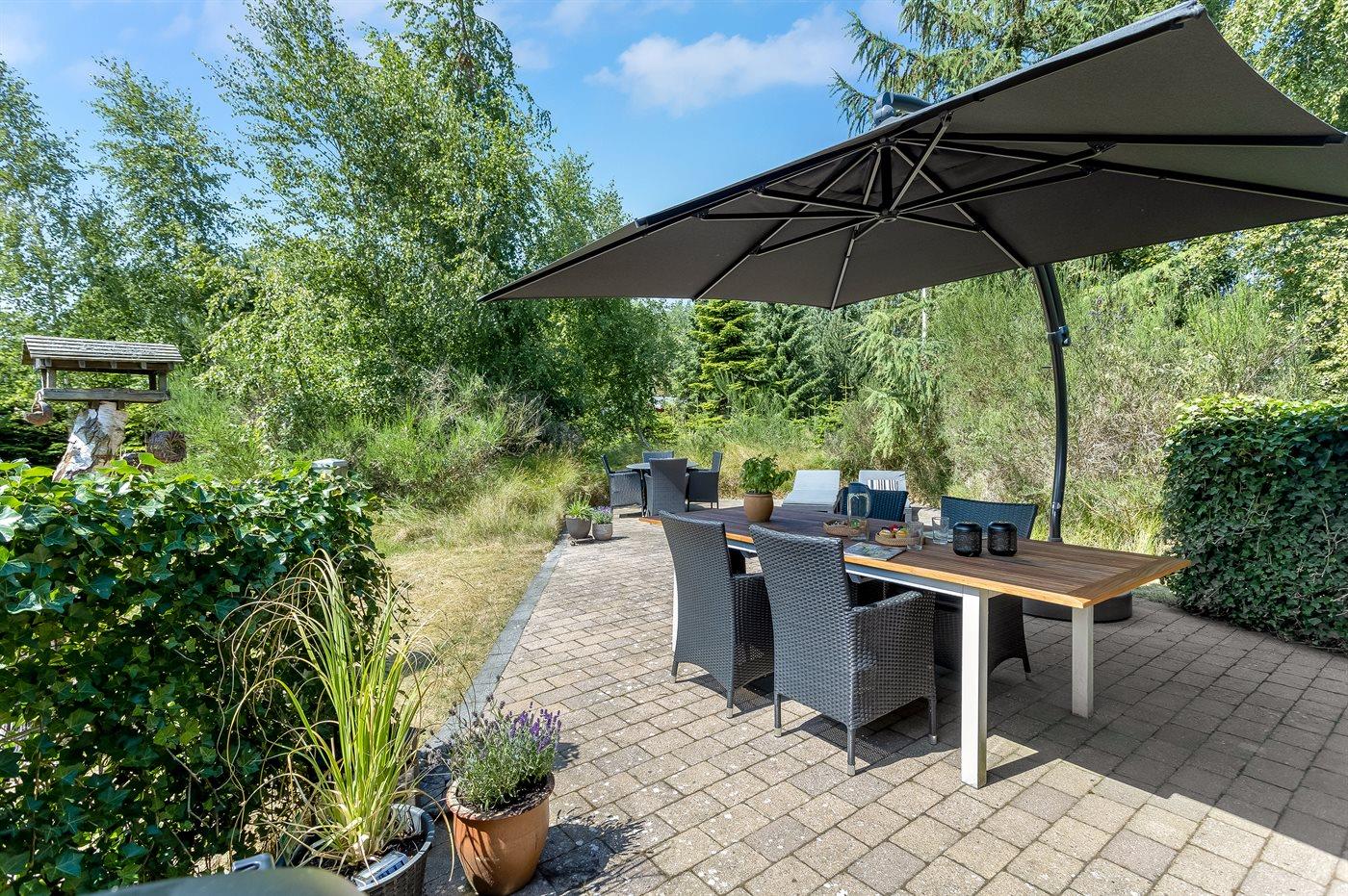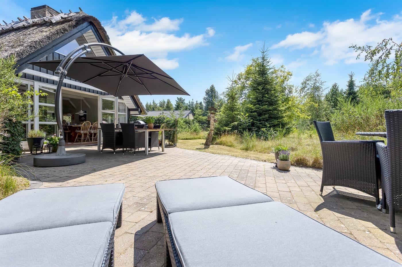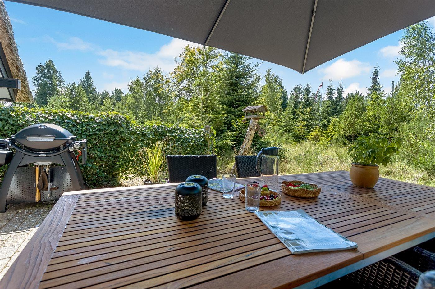 Fra stuen kan I gå ud på den store terrasse med solvogne, havemøbler og gasgrill. Der er flere forskellige steder på grunden med bord og stole, hvor I kan nyde morgenkaffen, men også mulighed for at trække i skyggen.