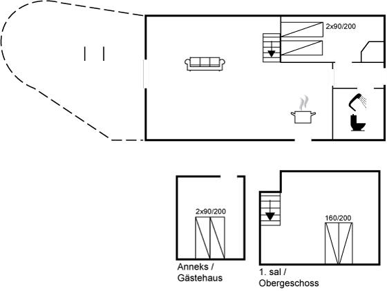I annekset er der 2 enkelte sovepladser, de er skubbet sammen til en dobbelt opredning hvis I hellere ønsker dette. Annekset er ikke isoleret, men har både el- og olieradiator som varmekilde til vinterkolde dage og mulighed for solcelledrevet ventilation til varme sommerdage. Fra køkkendøren er der få meter over til annekset.