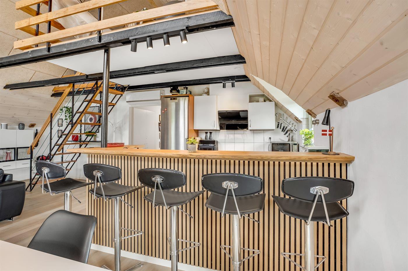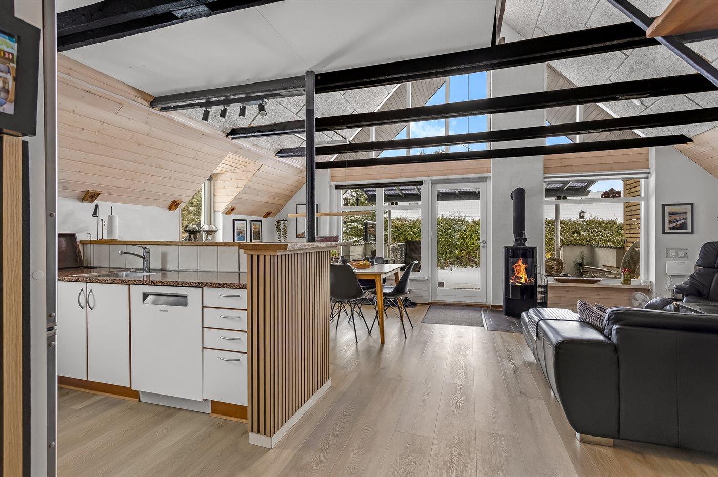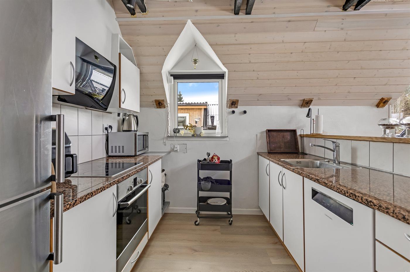 Køkkenet er udstyret med 1 køleskab. Der er 4 keramiske kogeplader, varmluftovn, mikrobølgeovn samt opvaskemaskine.
